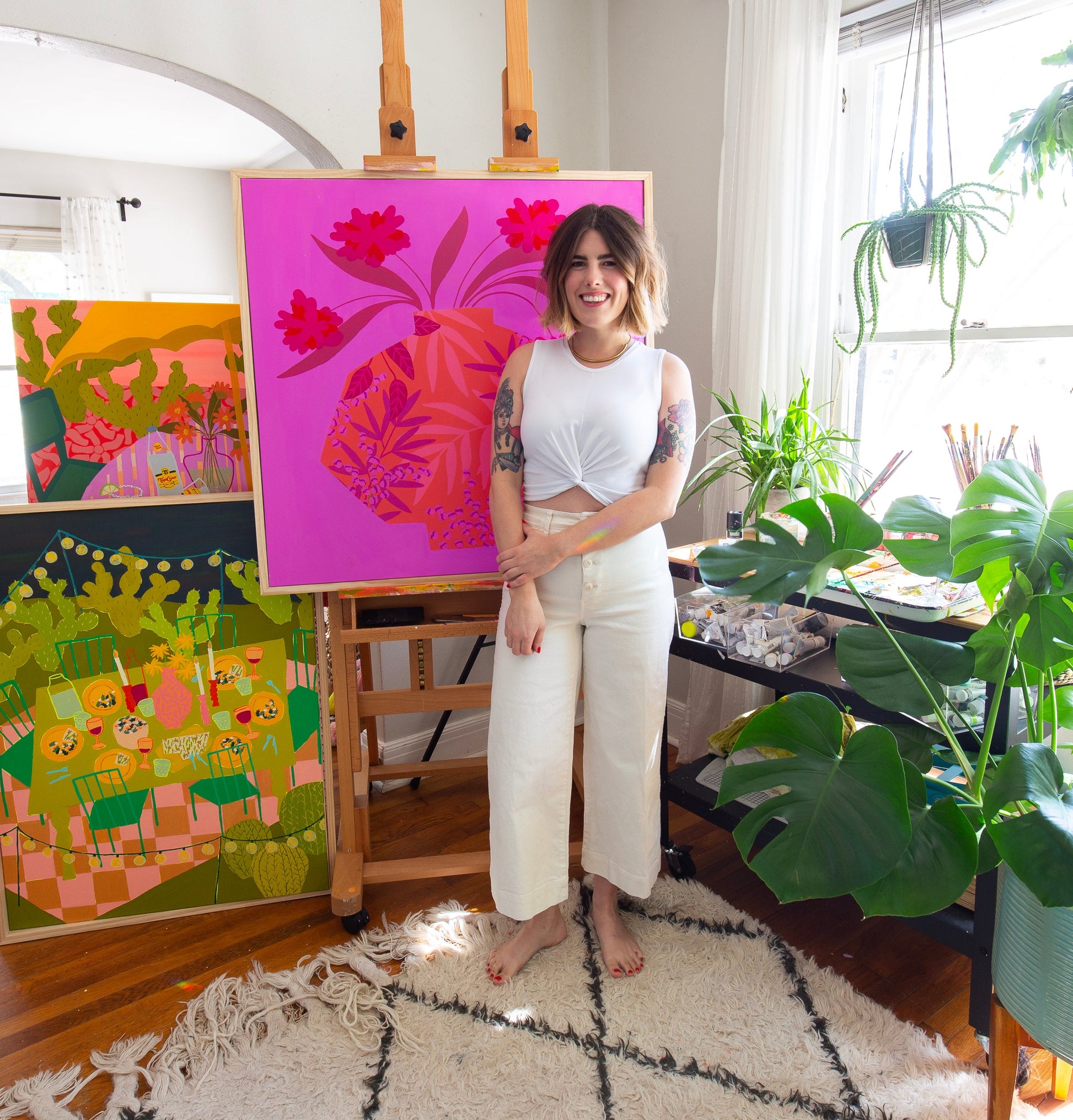 Bailey Schmidt is a painter living and working in Charlotte, North Carolina. She began her artistic career as a printmaker and graphic designer, which has influenced the way she paints today. Her paintings are full of bold color and pattern and highlight her love of florals and interiors. She likes to challenge herself with unexpected color combinations and unconventional pattern mixing while keeping a critical eye on composition and visual balance. She wants her work to be known for being cheerful and bringing joy to a space.