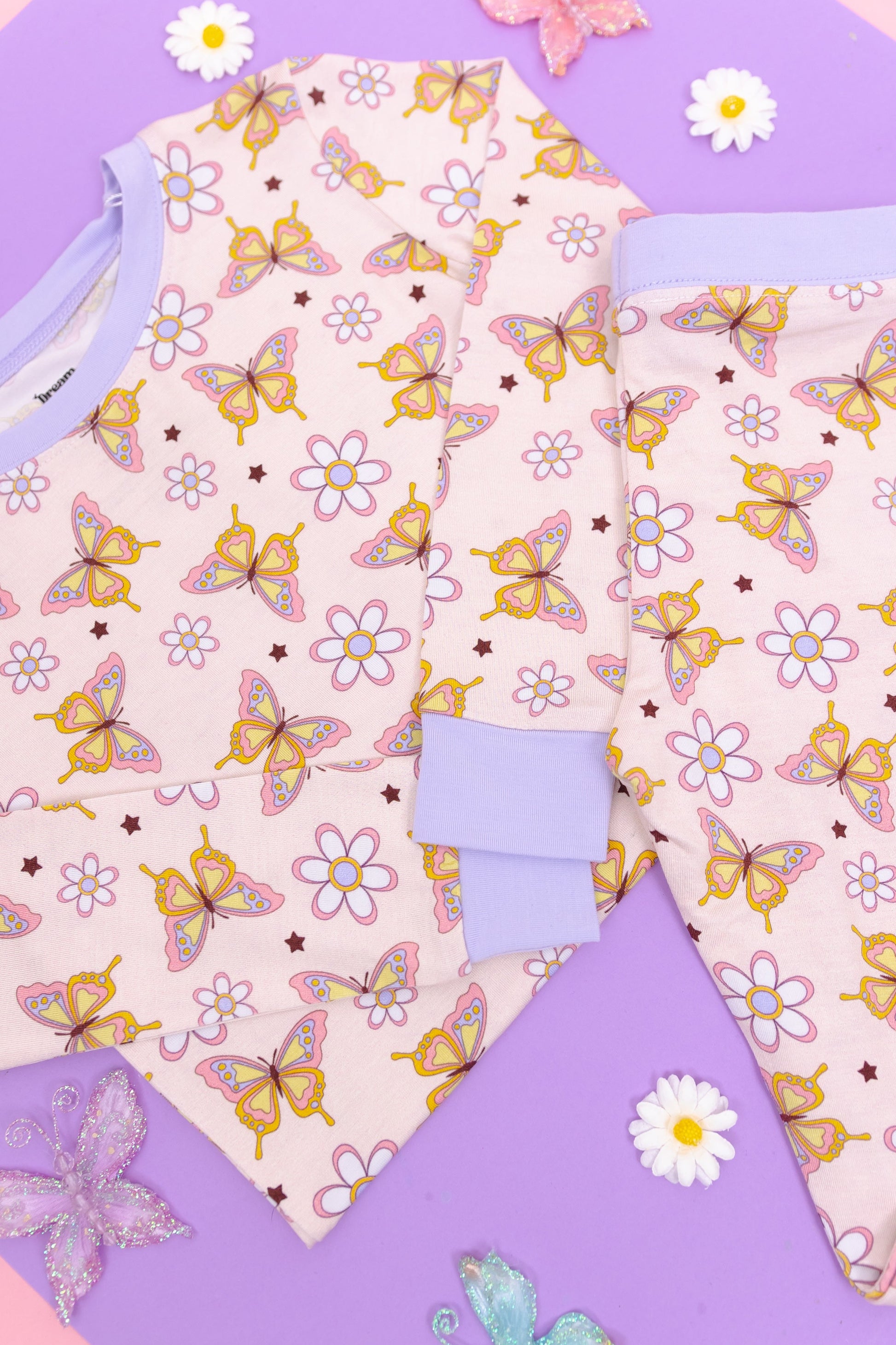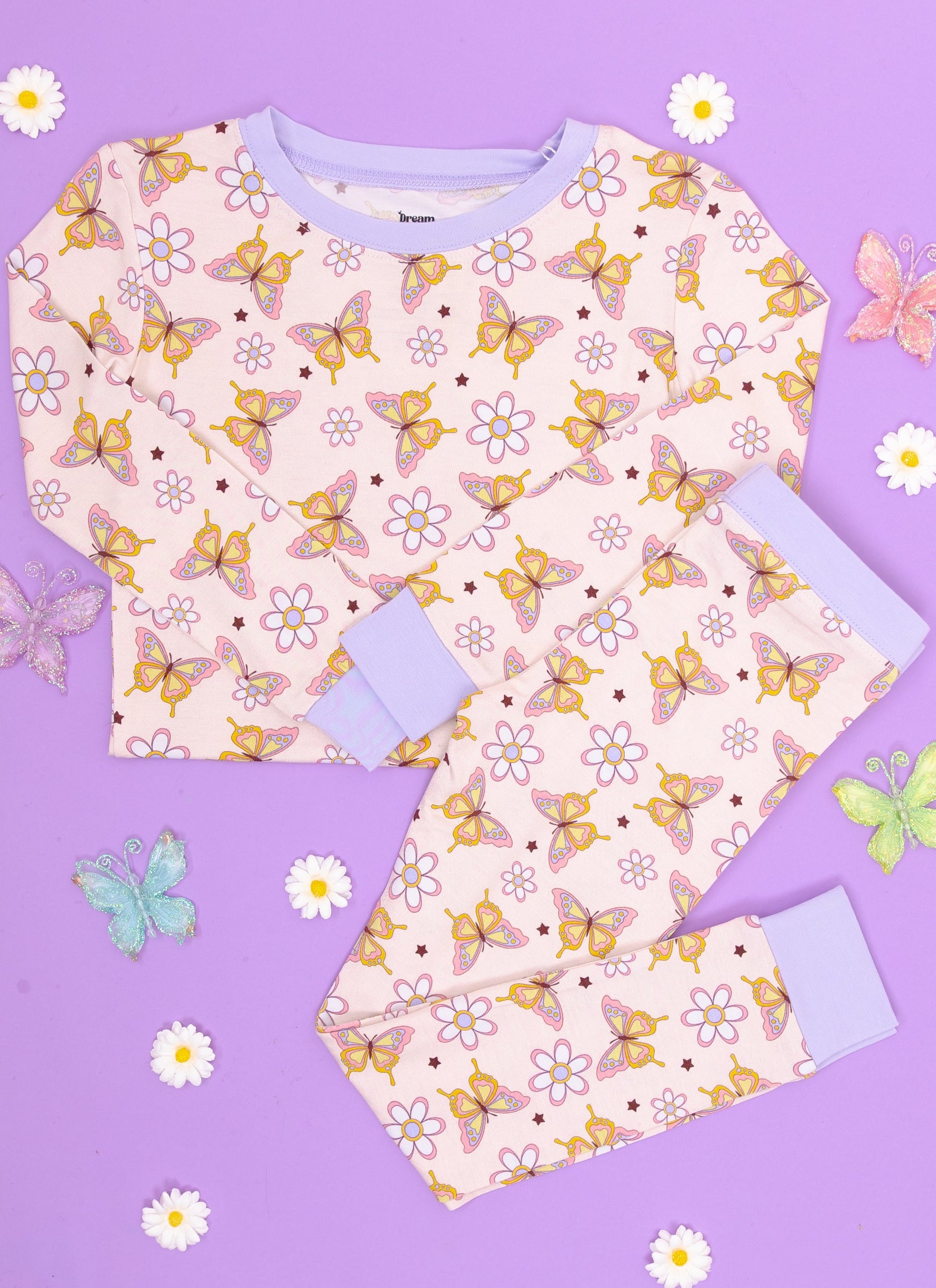 Get ready to drift off into a butterfly-filled dreamland with our Blossomin' Butterfly Dream Set! Featuring a charming butterfly print, this long sleeve set is perfect for a comfortable sleep and play experience. Made with bamboo material, it's soft and gentle on your skin. Sleep never looked so sweet!
