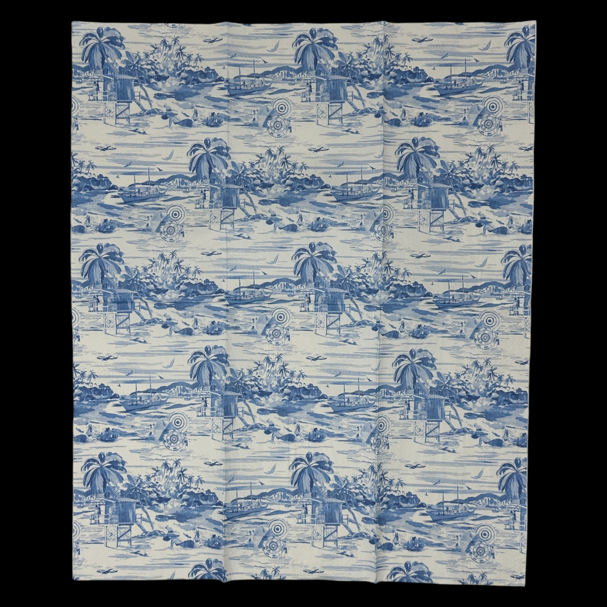 Elevate your crafts with the timeless elegance of toile design. These guest-size blue and white decoupage napkins feature a scenic coastal toile pattern, including palm trees, lifeguard towers, sailboats, and seaside charm. Perfect for adding a refined yet relaxed coastal touch to your DIY projects.