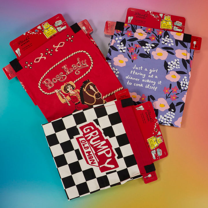 The Boss Lady Cowgirl Western Retro Funny Cooking and BBQ Apron by Blue Q at GetBullish is made from 100% cotton twill for durability. With an adjustable neck strap, extra-long waist ties, and two handy pockets, this apron is perfect for wrangling ingredients in the kitchen or charging through BBQ messes with ease. Not only is this Blue Q apron easy to care for with machine washable cotton twill, but it also gives back to hunger relief programs around the world with one percent of the sale donated. Stay stylish and support a good cause while cooking like a boss!