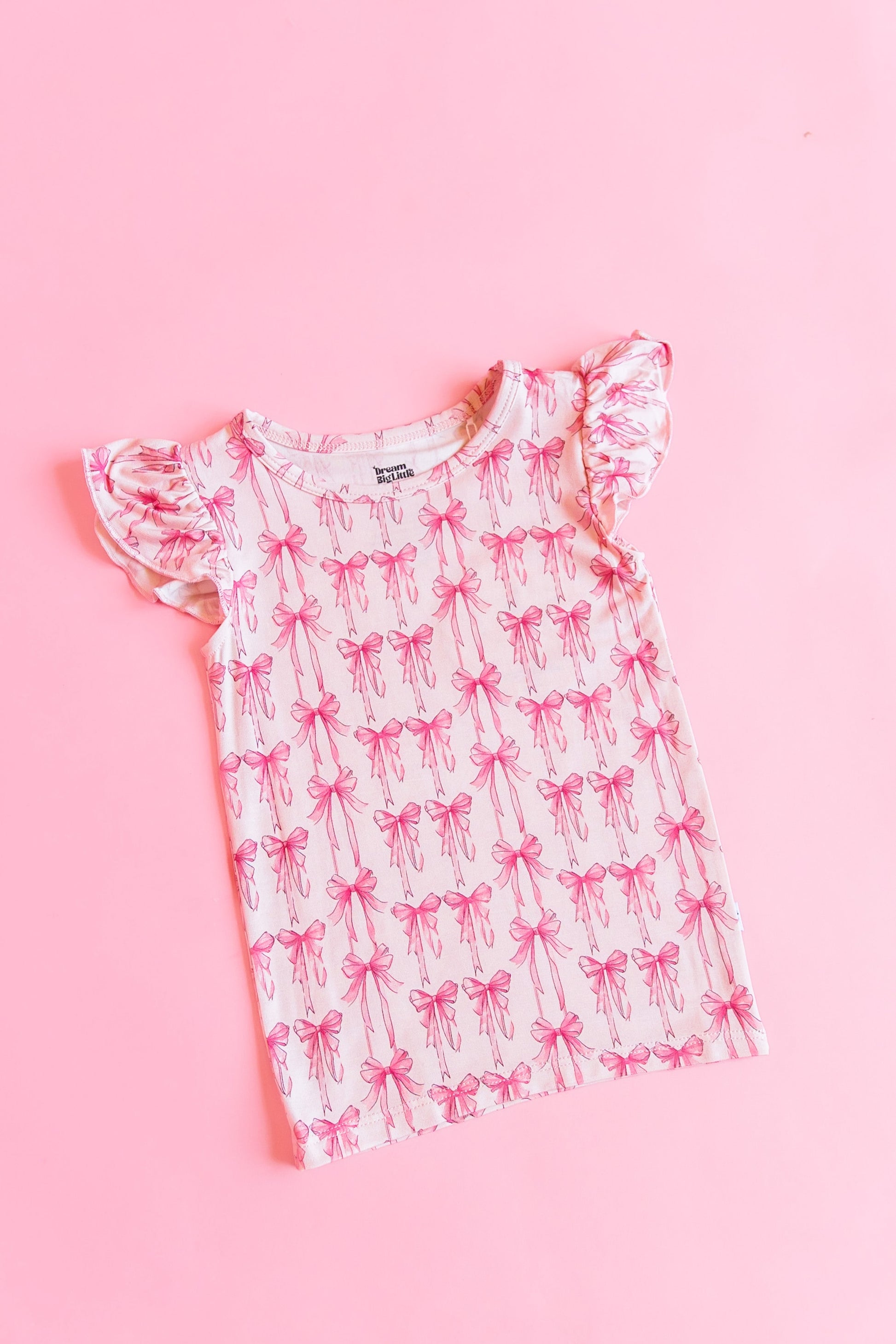 Get your dream summer look with our Bow Cute Dream Cap Sleeve Top! Made from comfortable bamboo material, this top features a beautiful bow print that will make you stand out. Grab the matching ruffle shorts for the perfect outfit. Don't miss out on this adorable piece!