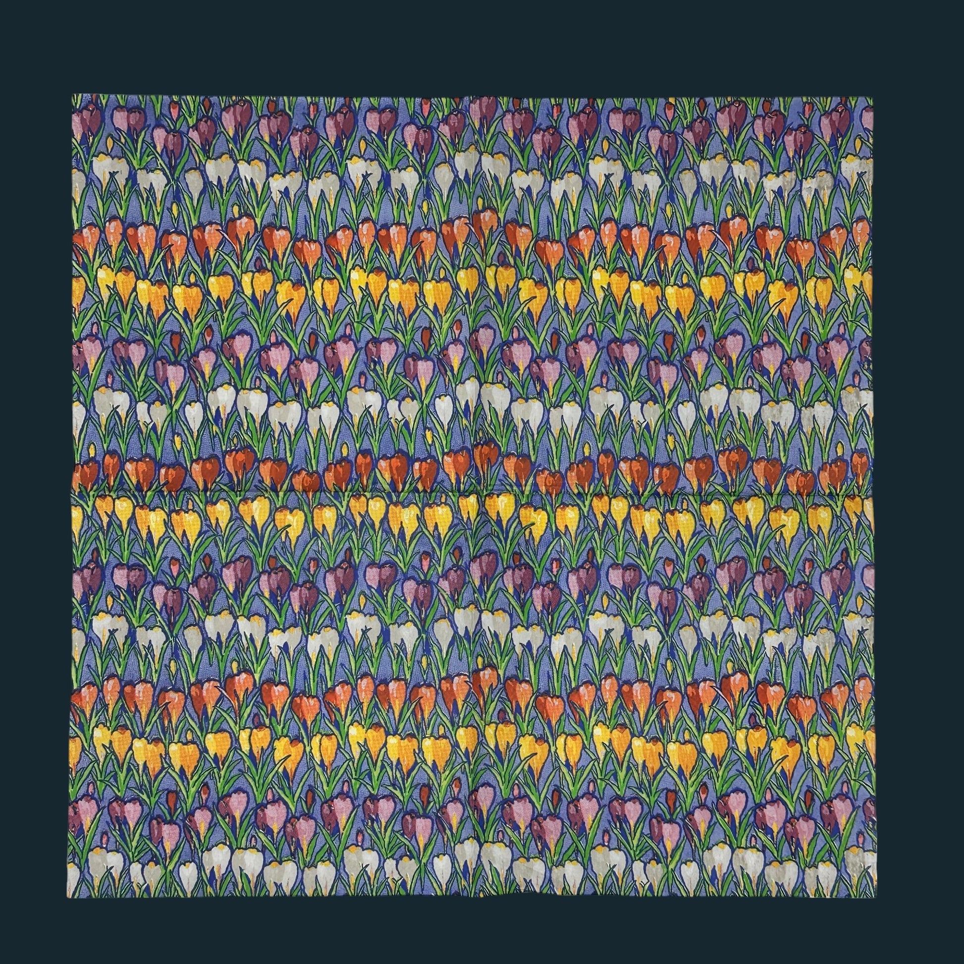 Celebrate the beauty of spring with our Crocus Flower Field Luncheon Decoupage Napkins. These German-made napkins feature vibrant rows of purple, yellow, orange, and white crocuses on a rich blue background, bringing cheerful seasonal color to your craft projects.