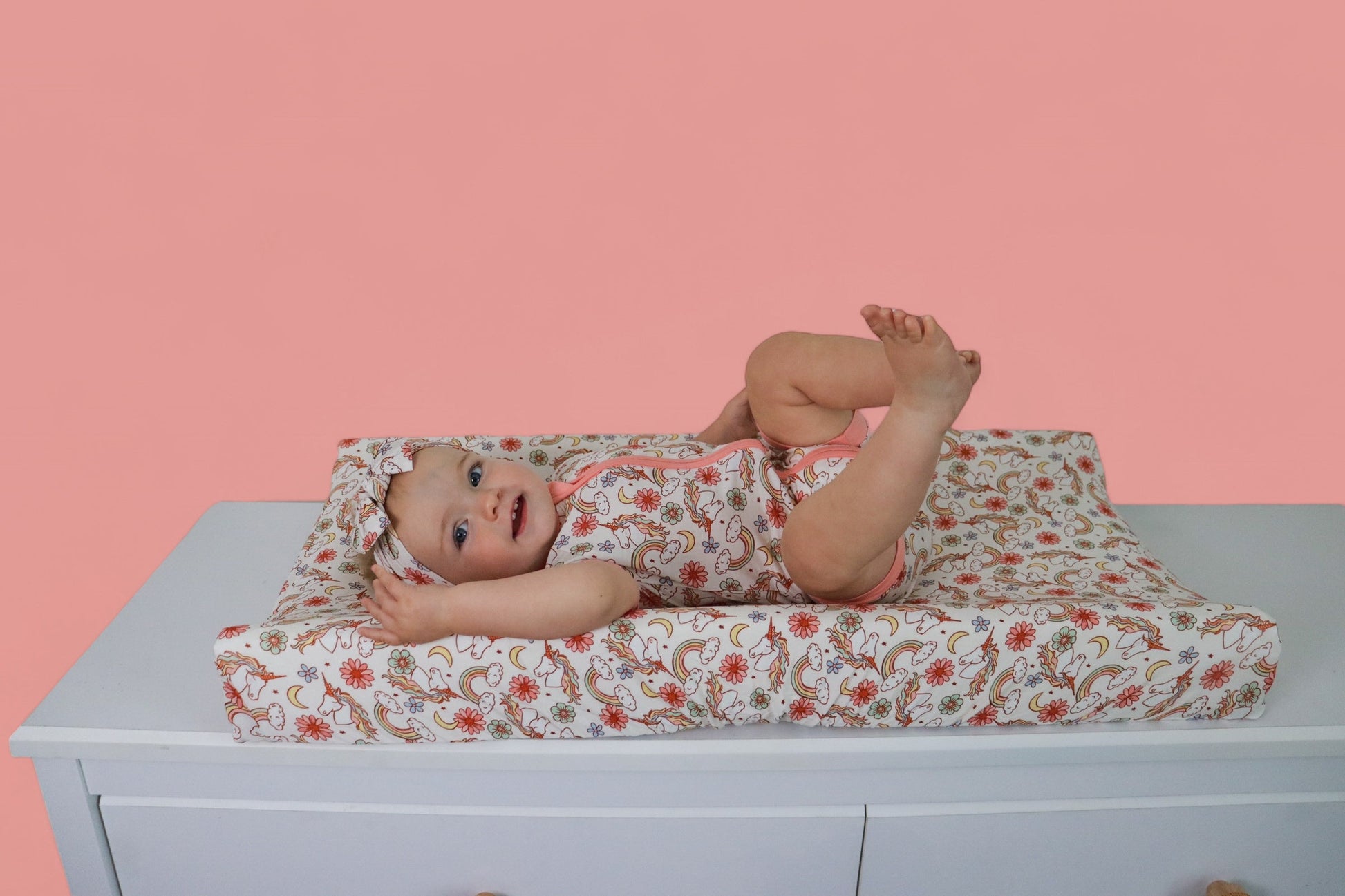 Elevate your nursery style with the Exclusive Enchanted Dreams Dream Changing Pad Cover! This whimsical cover features a delightful design of rainbows and unicorns, bringing a touch of magic to your little one’s space. Crafted from the softest and most breathable bamboo viscose material, it ensures that your baby remains comfortable during diaper changes.