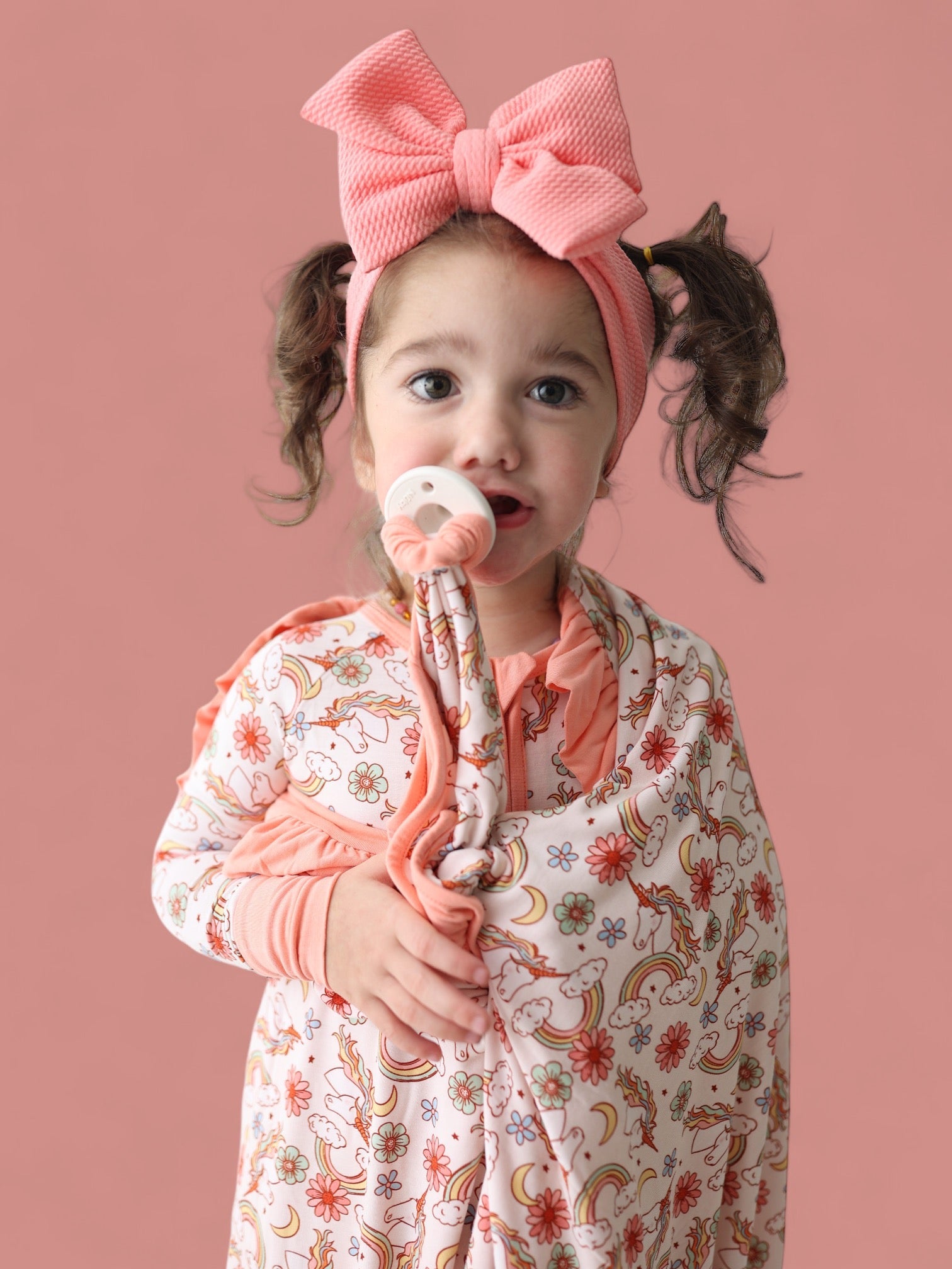 The Exclusive Enchanted Dreams Lovey is pure magic for your little one. With whimsical rainbows, unicorns, and a magical print, this lovey is designed to provide extra security and comfort at her fingertips. Your babe will love the soft, soothing touch of the bamboo viscose material, making it the perfect cuddle companion for nap time, bedtime, or any time in between.