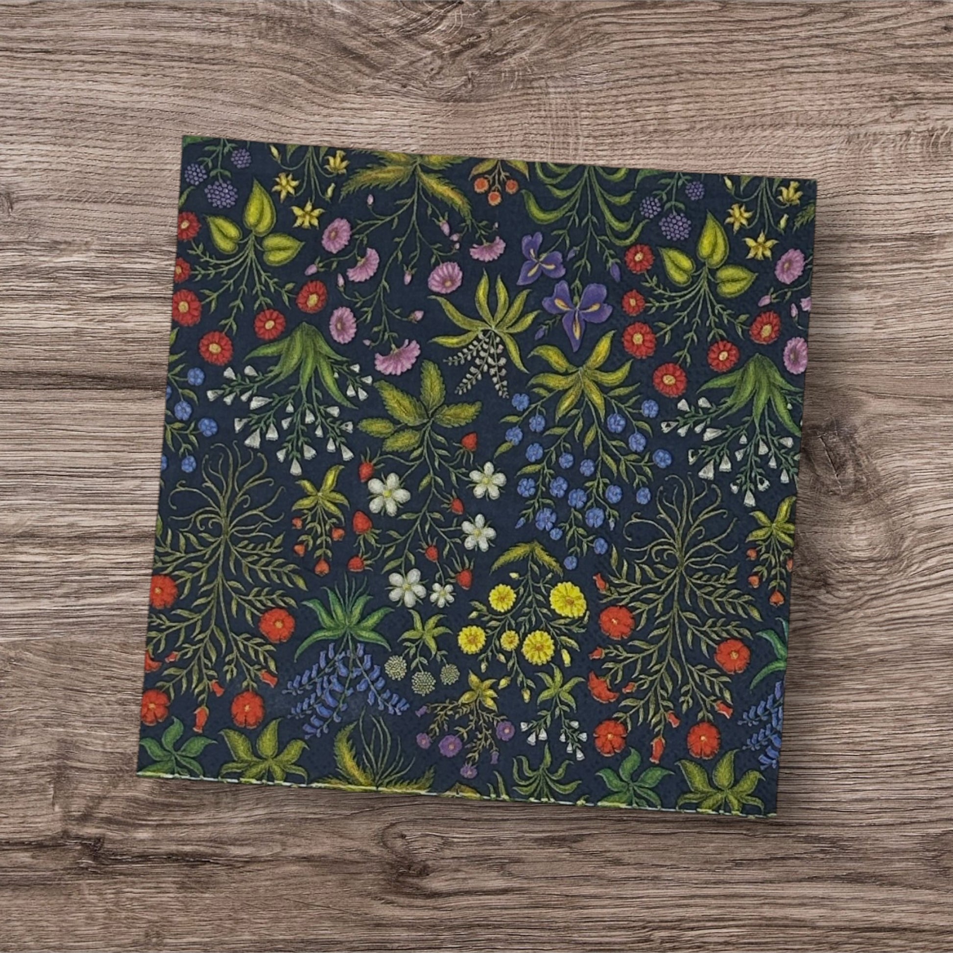 Bring a touch of elegance to your crafts with these Wildflower Garden Decoupage Napkins. Featuring a colorful array of delicate flowers and greenery on a rich dark background, these luncheon-size napkins make any project pop with vibrant detail. Perfect for spring and summer crafts, mixed media, junk journaling, and DIY decor, this set of 2 high-quality 3-ply napkins will inspire endless creativity.