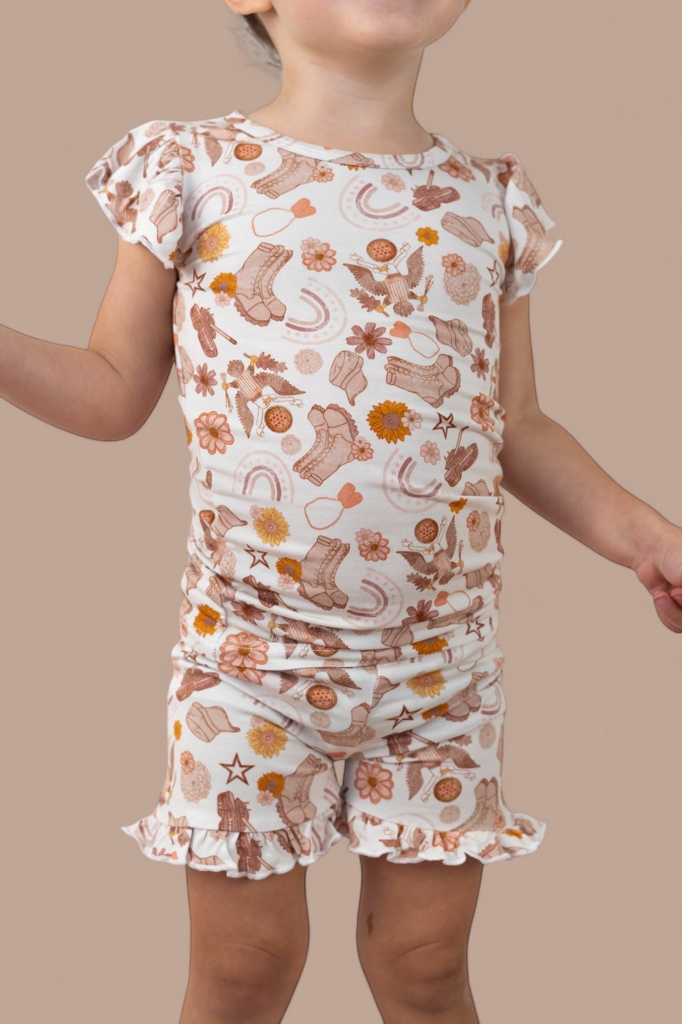Whether it’s a day out in the sunshine or lounging at home, the Flowers and Boots Dream Ruffle Short Set is the perfect addition to your child's wardrobe. Give your little girl the gift of comfort and style this season and let her enjoy endless adventures in her new favorite outfit!