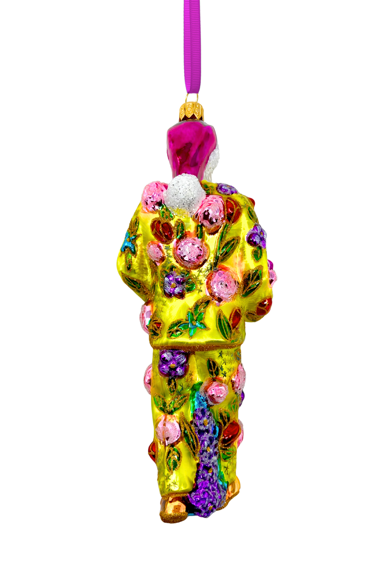 Wrapped in jeweled roses and a citrus-bright suit, this Santa struts through the orchard with a gift in hand and a sparkle in his step. He’s not just delivering presents—he’s delivering drama.