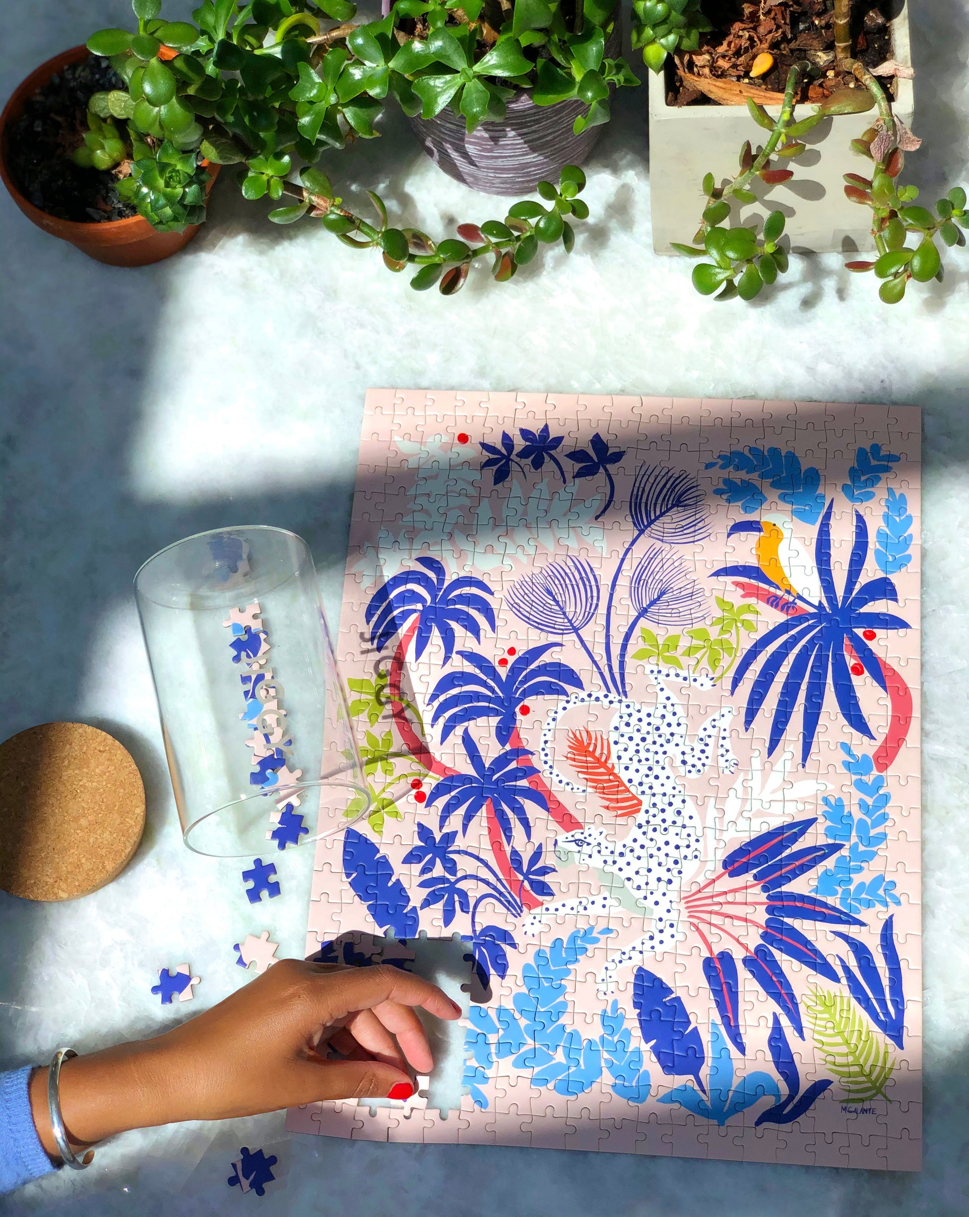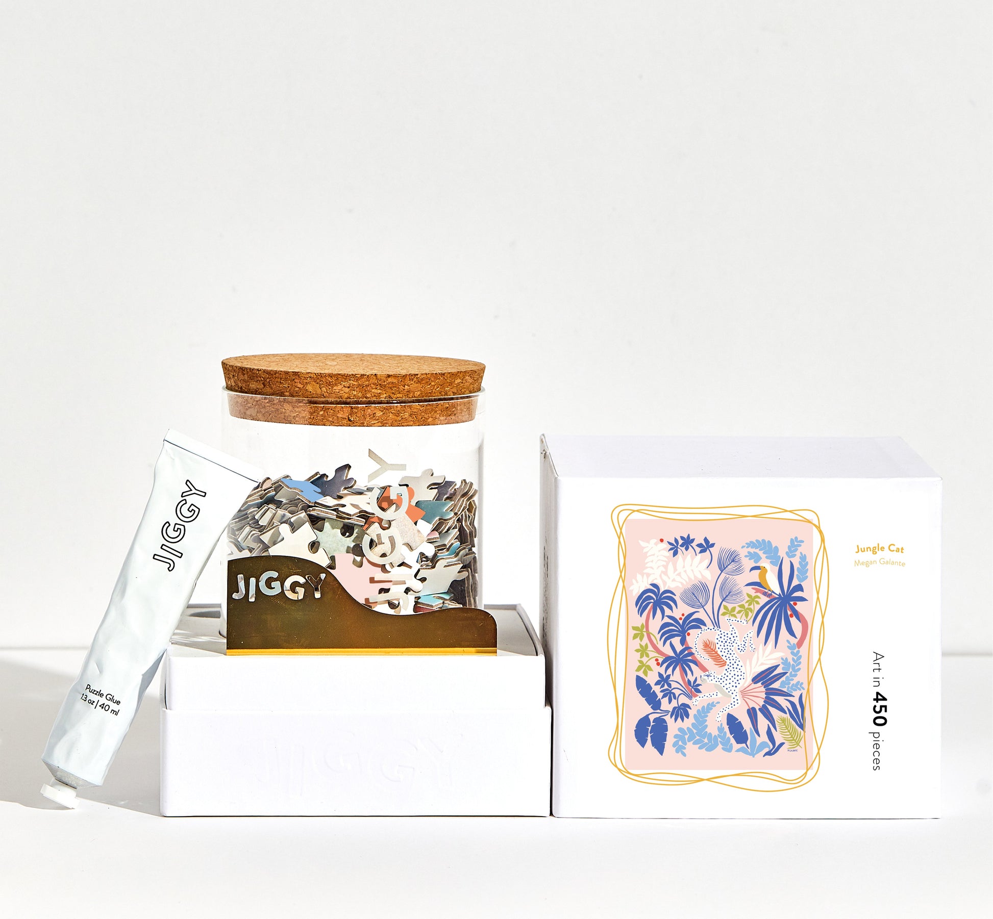 Each JIGGY puzzle comes in a reusable glass jar and includes a tube of puzzle glue, a straight-edge tool to spread the glue and a print of the art to follow.