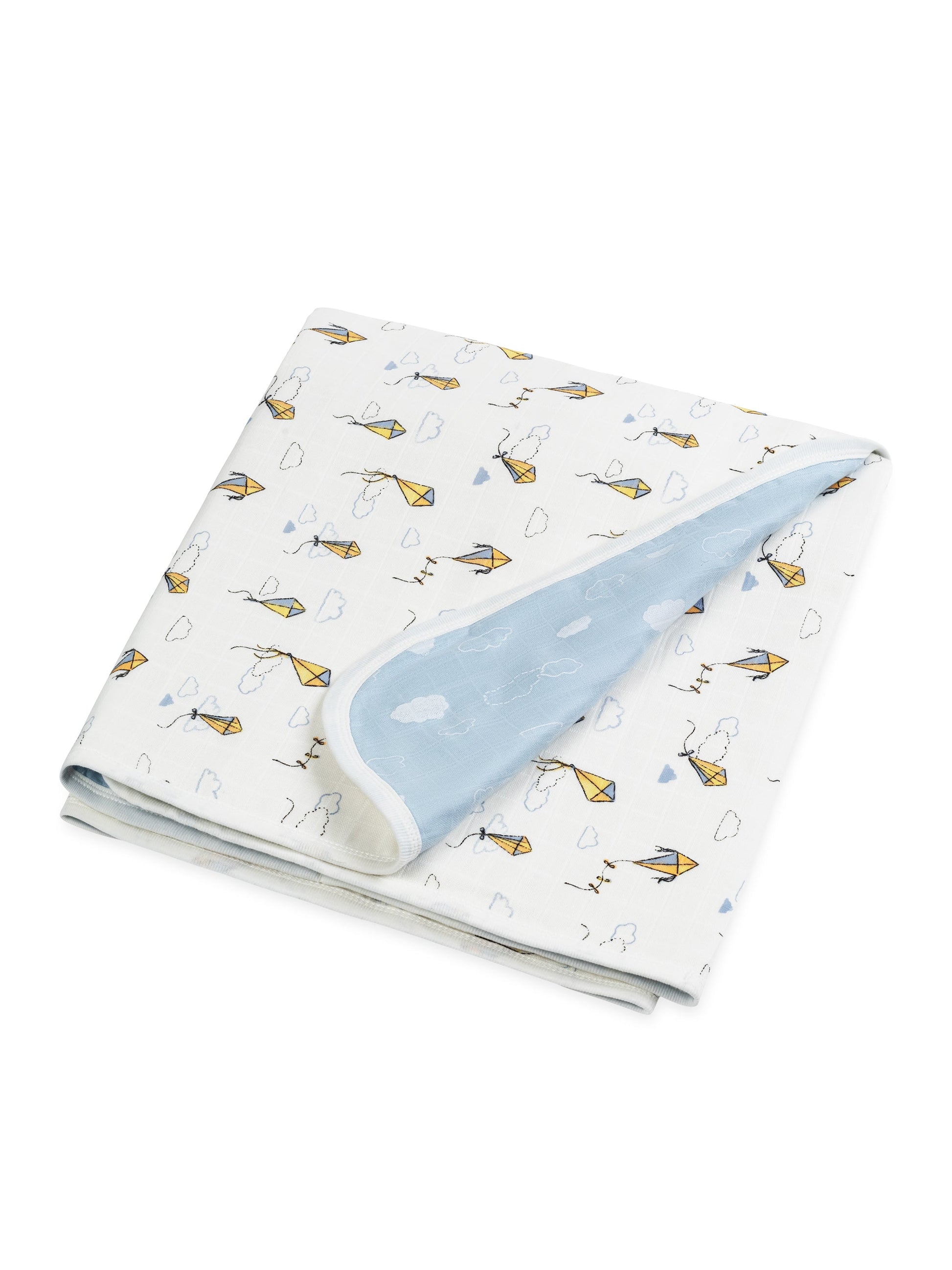 Double sided, this blanket has a kites on one side and clouds on the other.