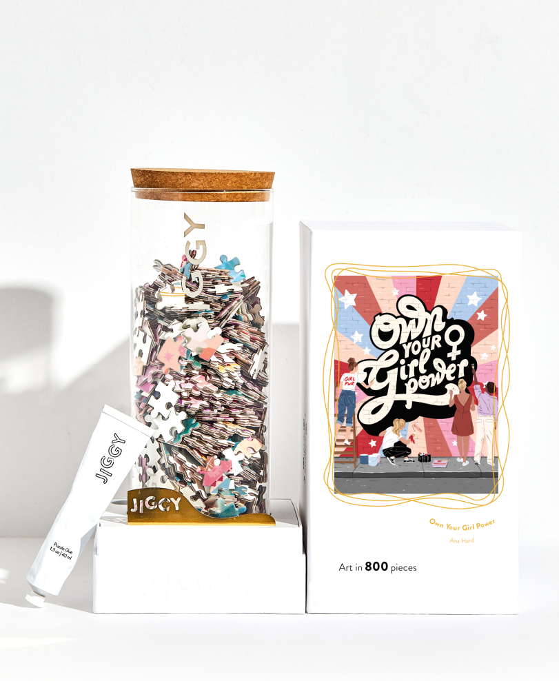 Each JIGGY puzzle comes in a reusable glass jar and includes a tube of puzzle glue, a straight-edge tool to spread the glue and a print of the art to follow.