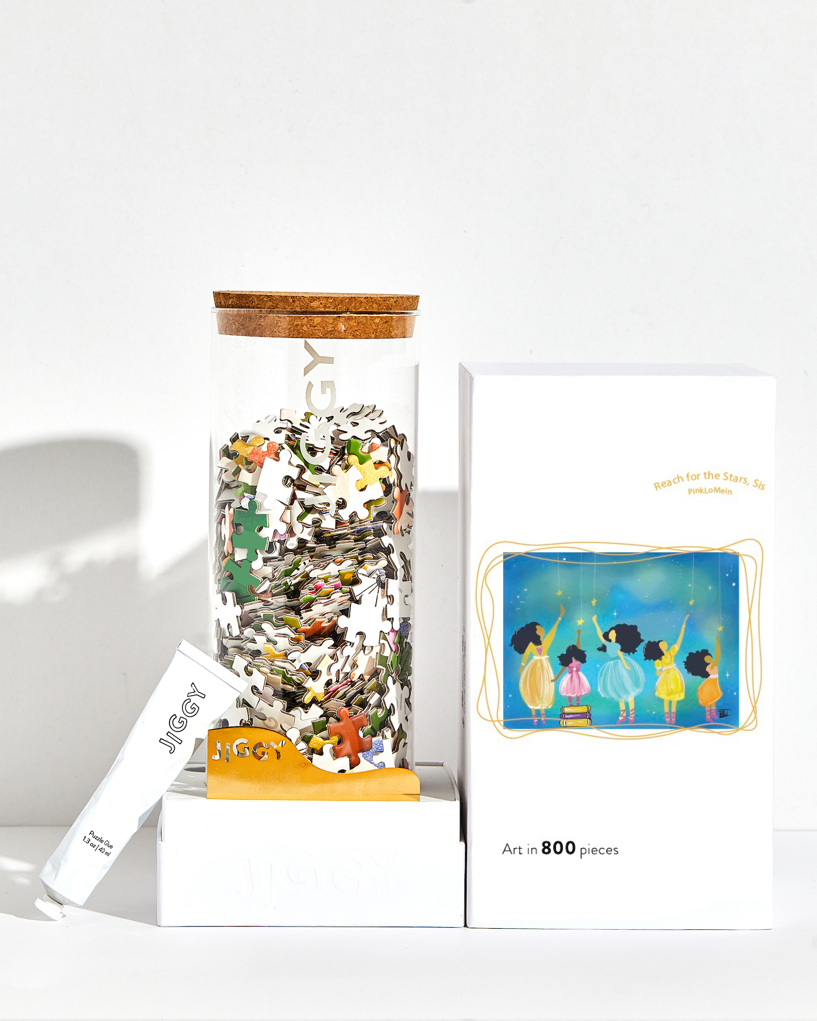 Each JIGGY puzzle comes in a reusable glass jar and includes a tube of puzzle glue, a straight-edge tool to spread the glue and a print of the art to follow.
