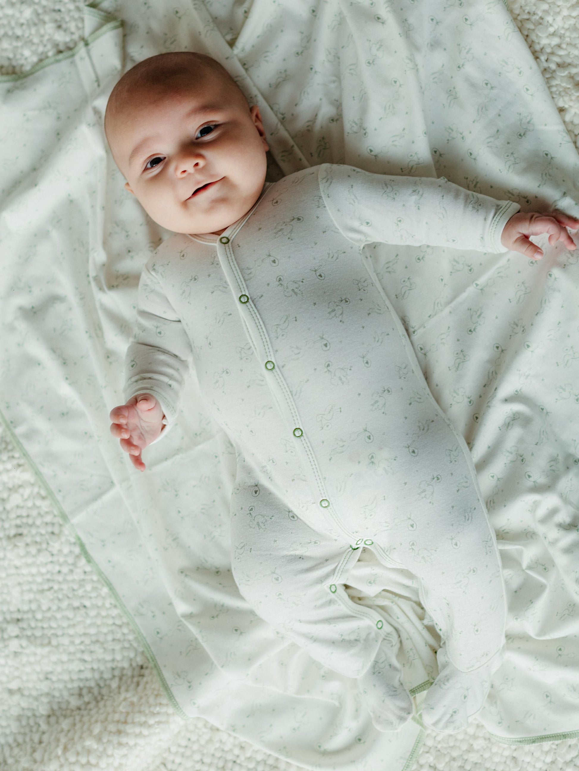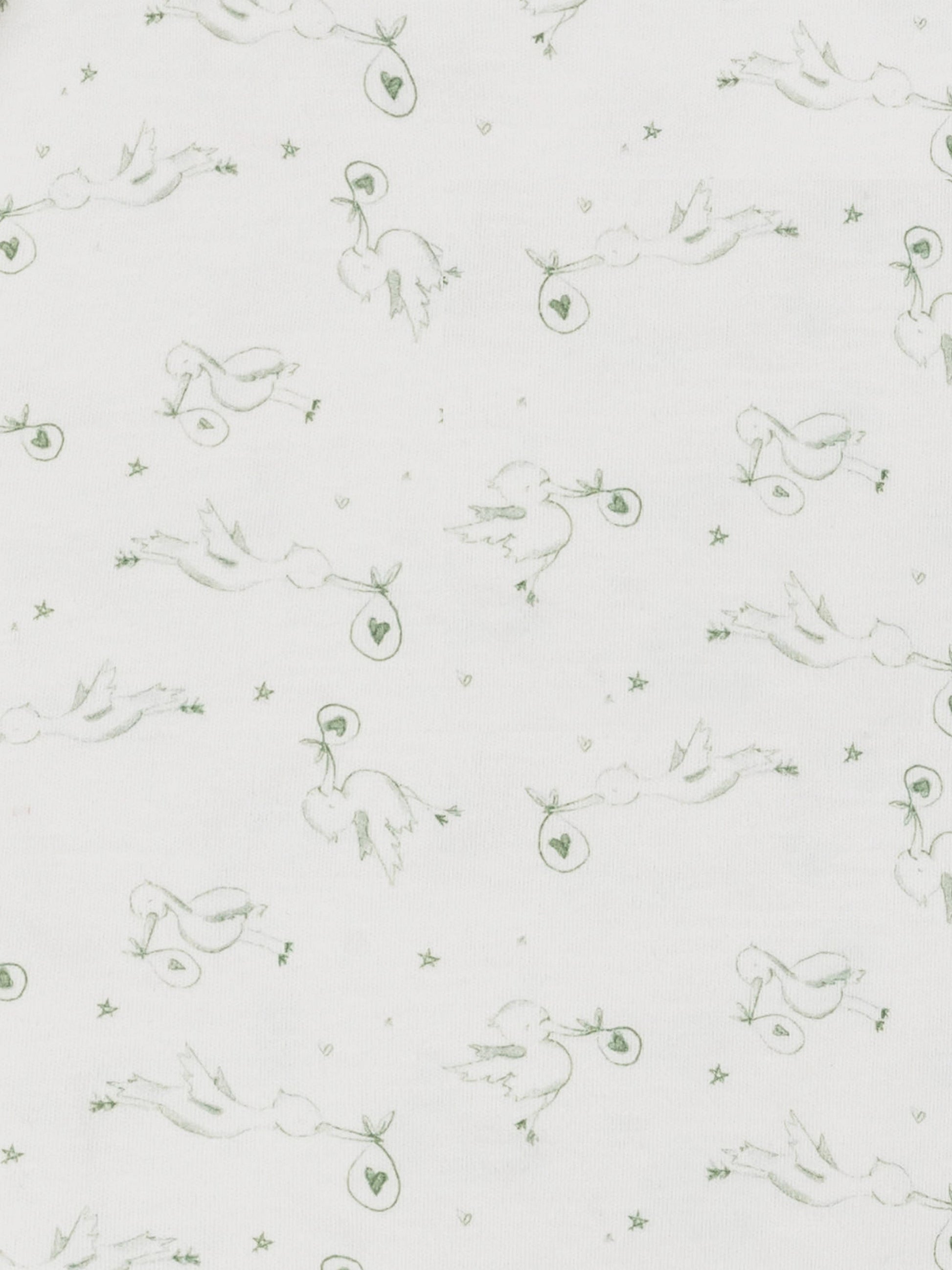 Features our unisex sage green stork print that coordinates back with the entire collection.