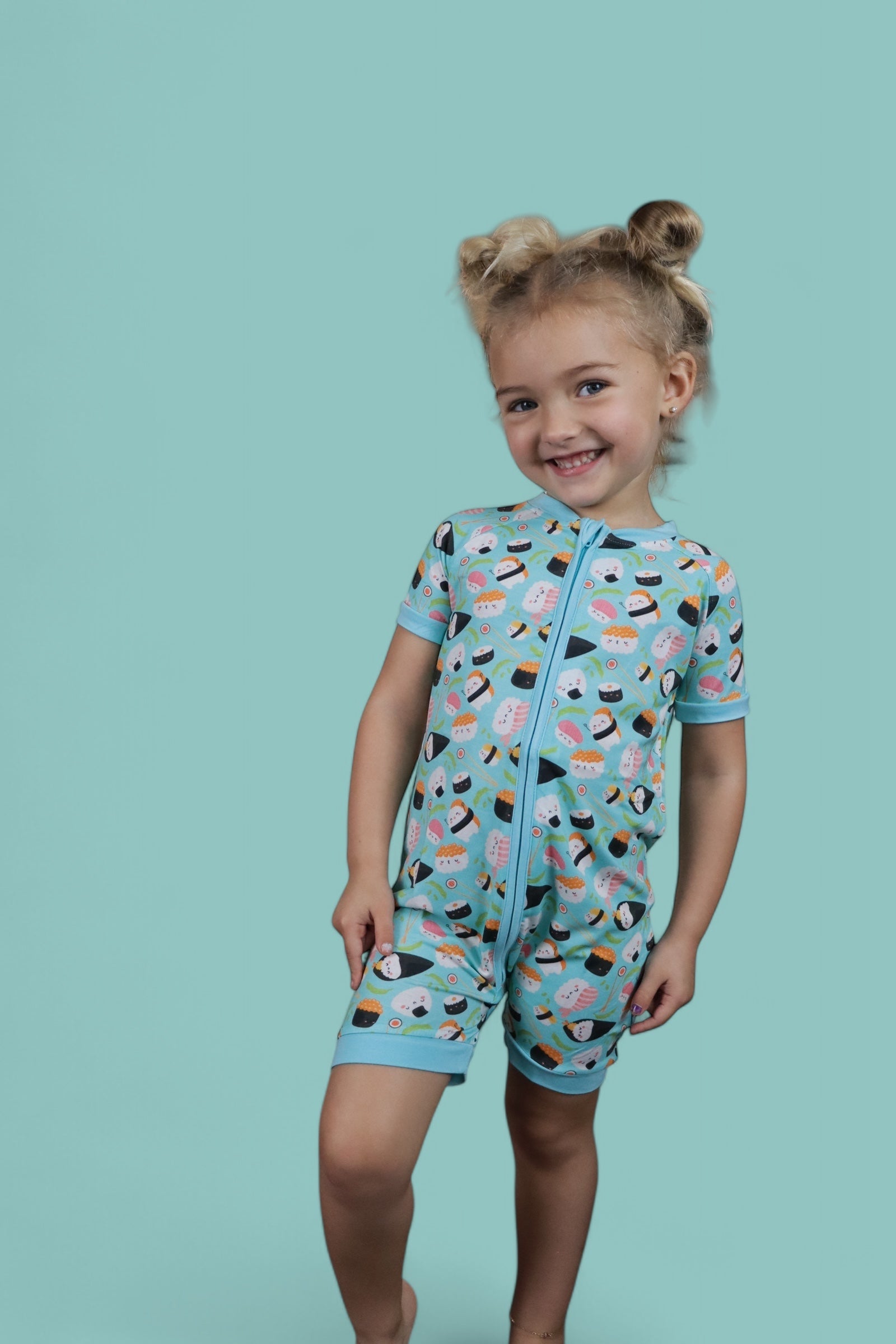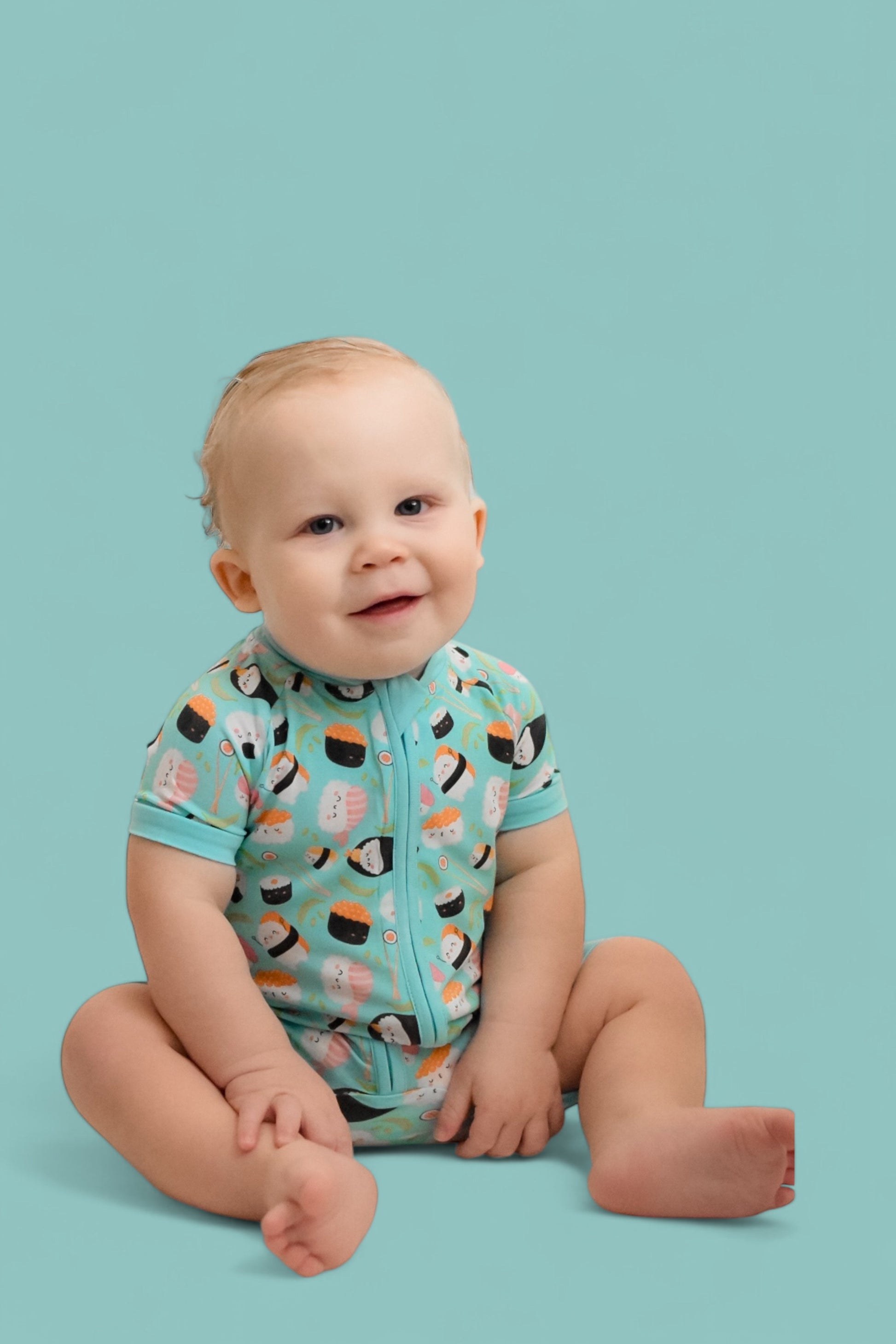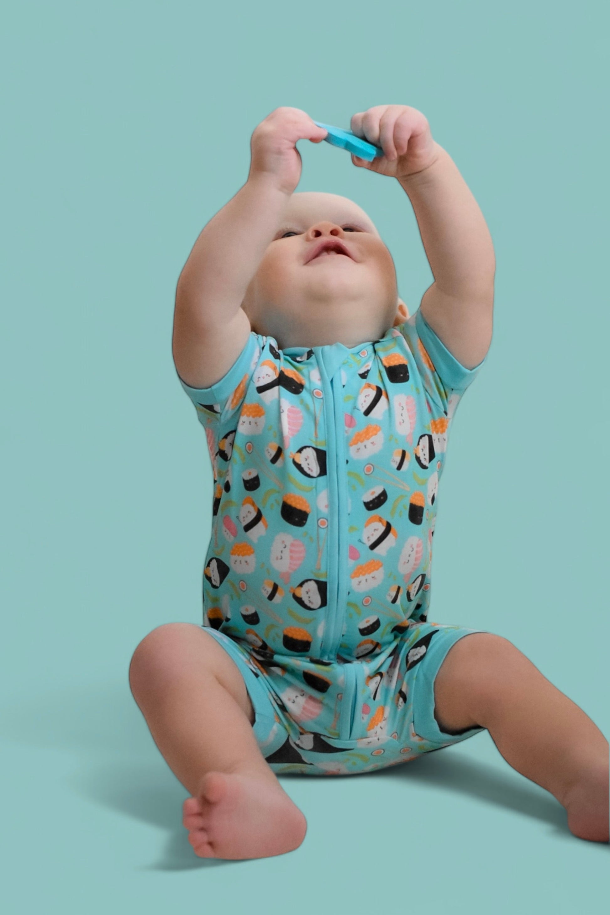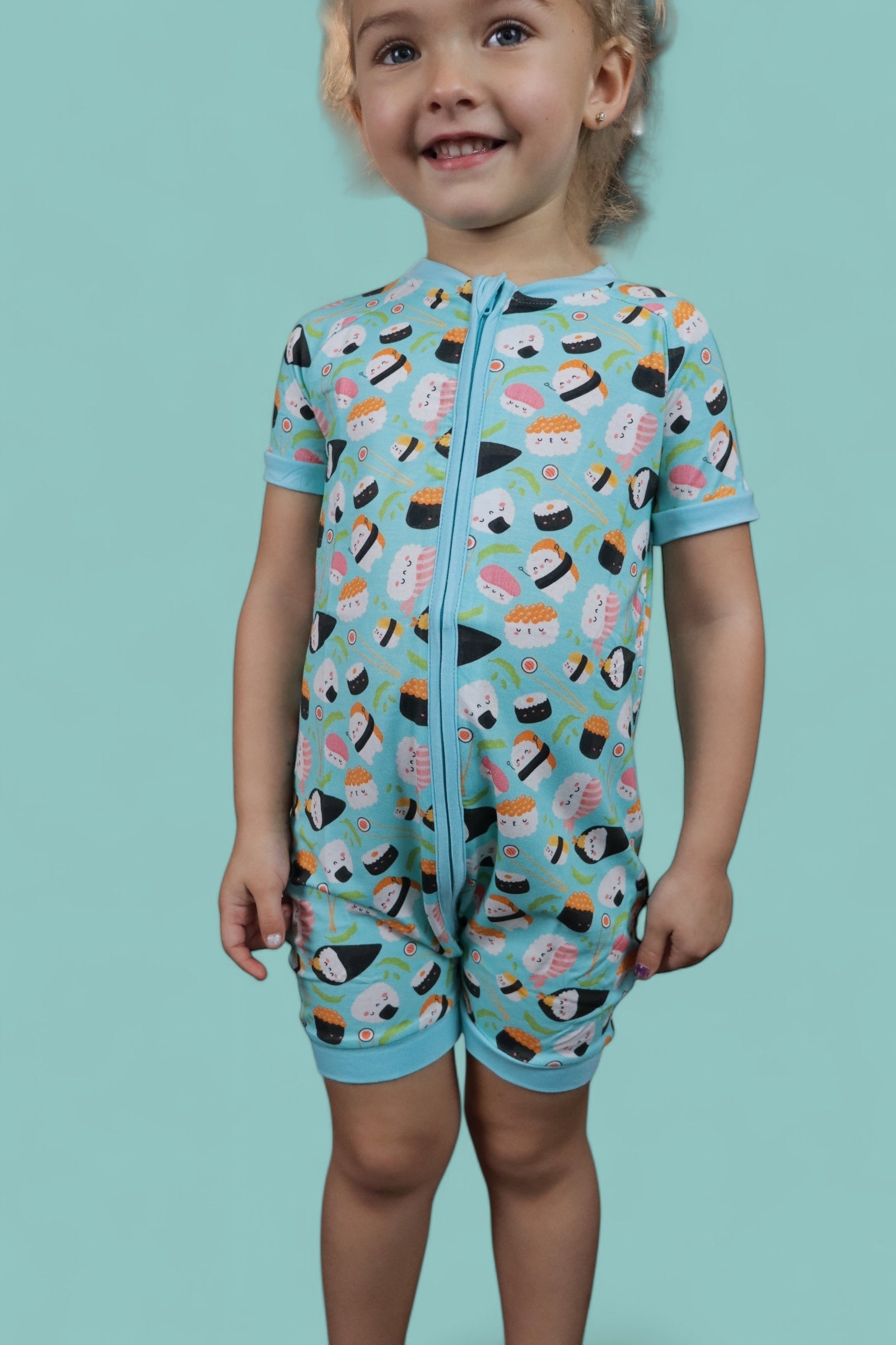 The sushi-themed print is as delightful as it gets—perfect for food-loving families or anyone who appreciates an adorable and unique design. Make your little one the star of the playdate with this fun and functional romper.