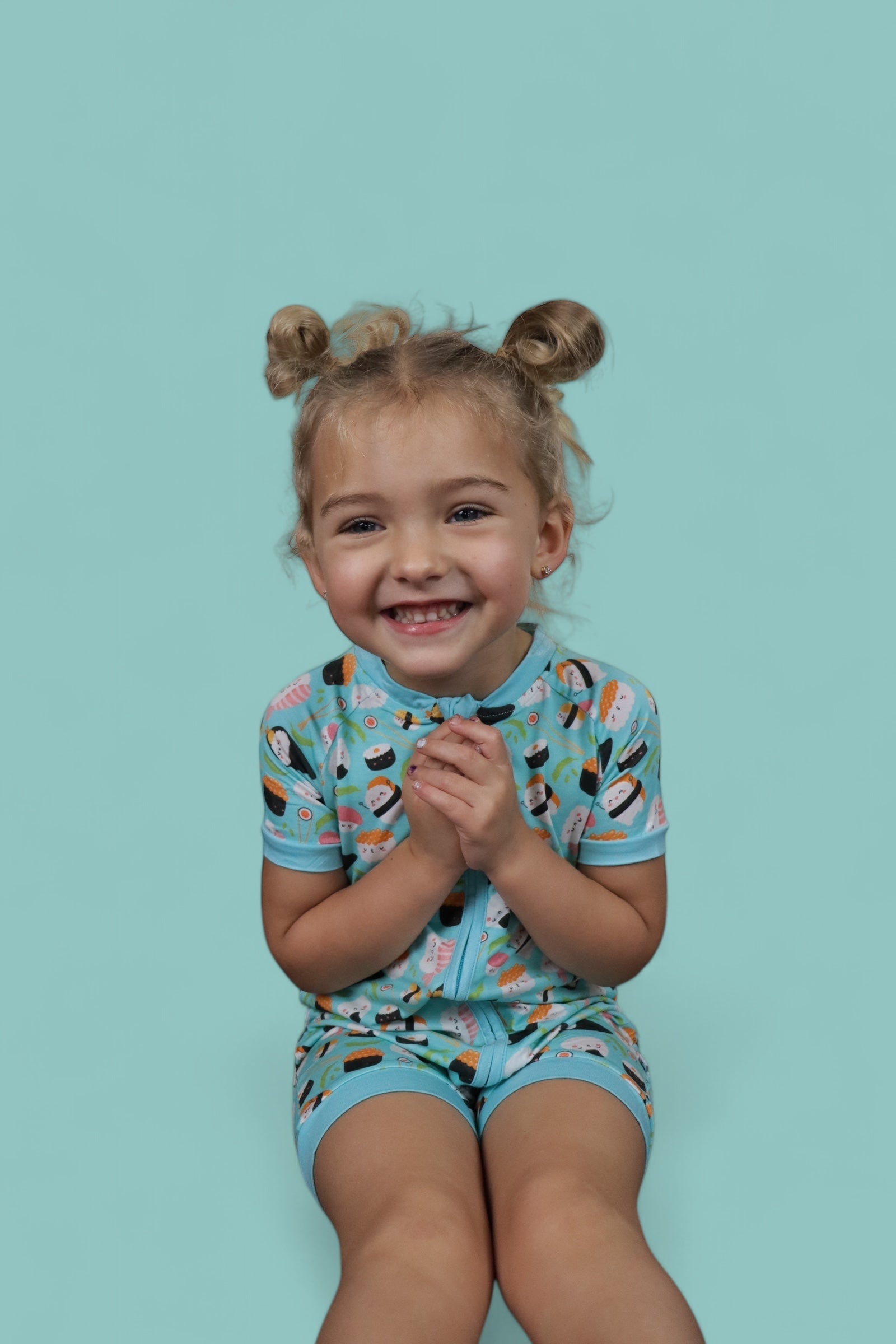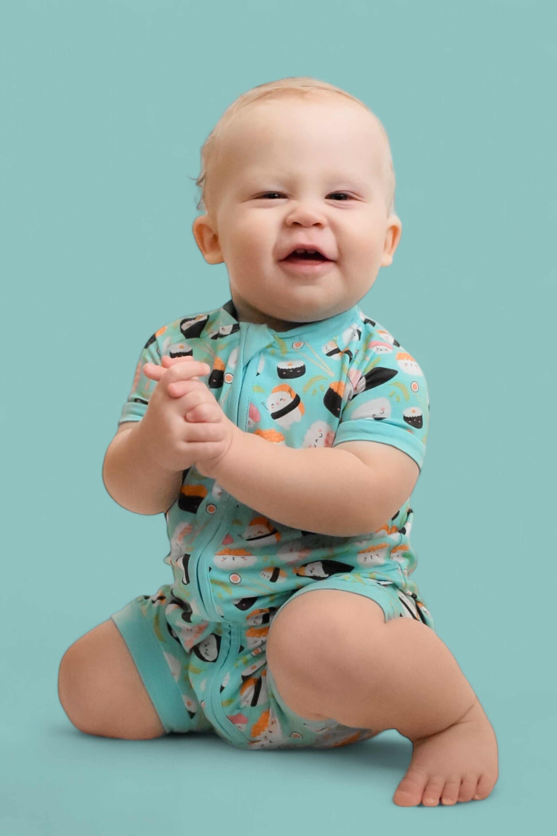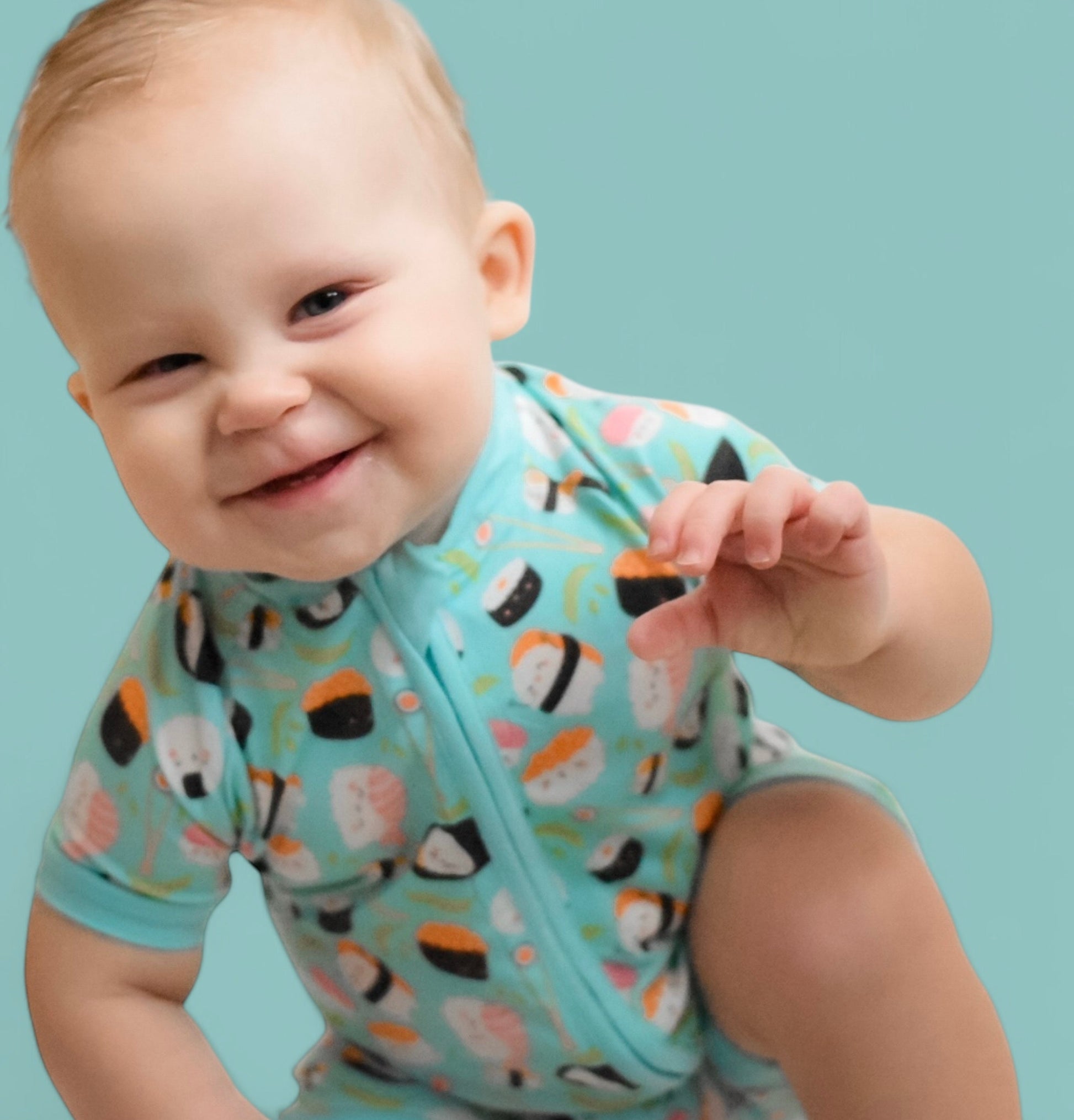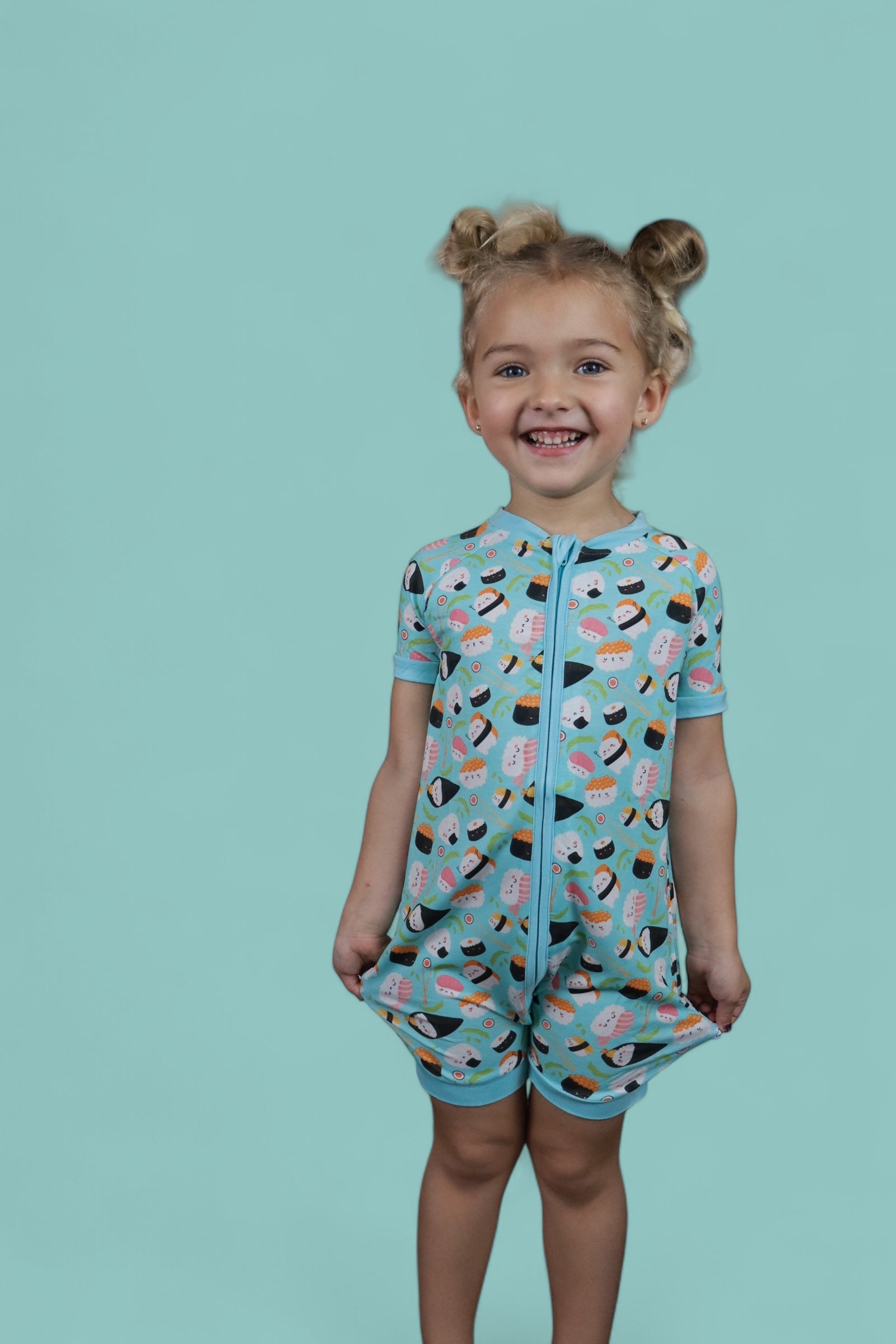The sushi-themed print is as delightful as it gets—perfect for food-loving families or anyone who appreciates an adorable and unique design. Make your little one the star of the playdate with this fun and functional romper.