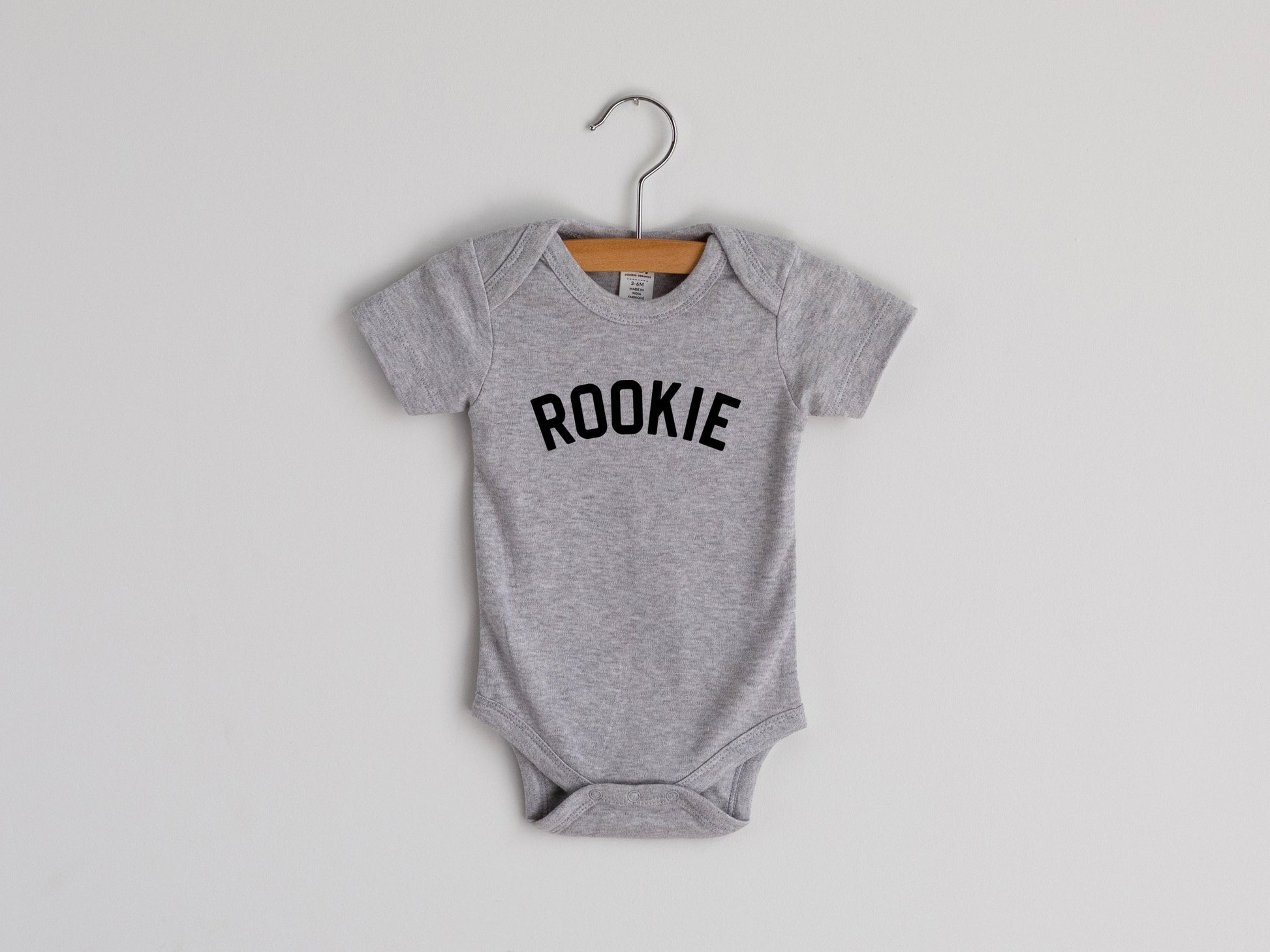 Let's welcome the new recruit! This super-soft outfit features modern typography in crisp black ink on a luxe cream-colored bodysuit, white ink on a camel bodysuit, and black ink on a grey bodysuit - designed with love and screen printed in-house. The perfect humorous outfit for a new babe!