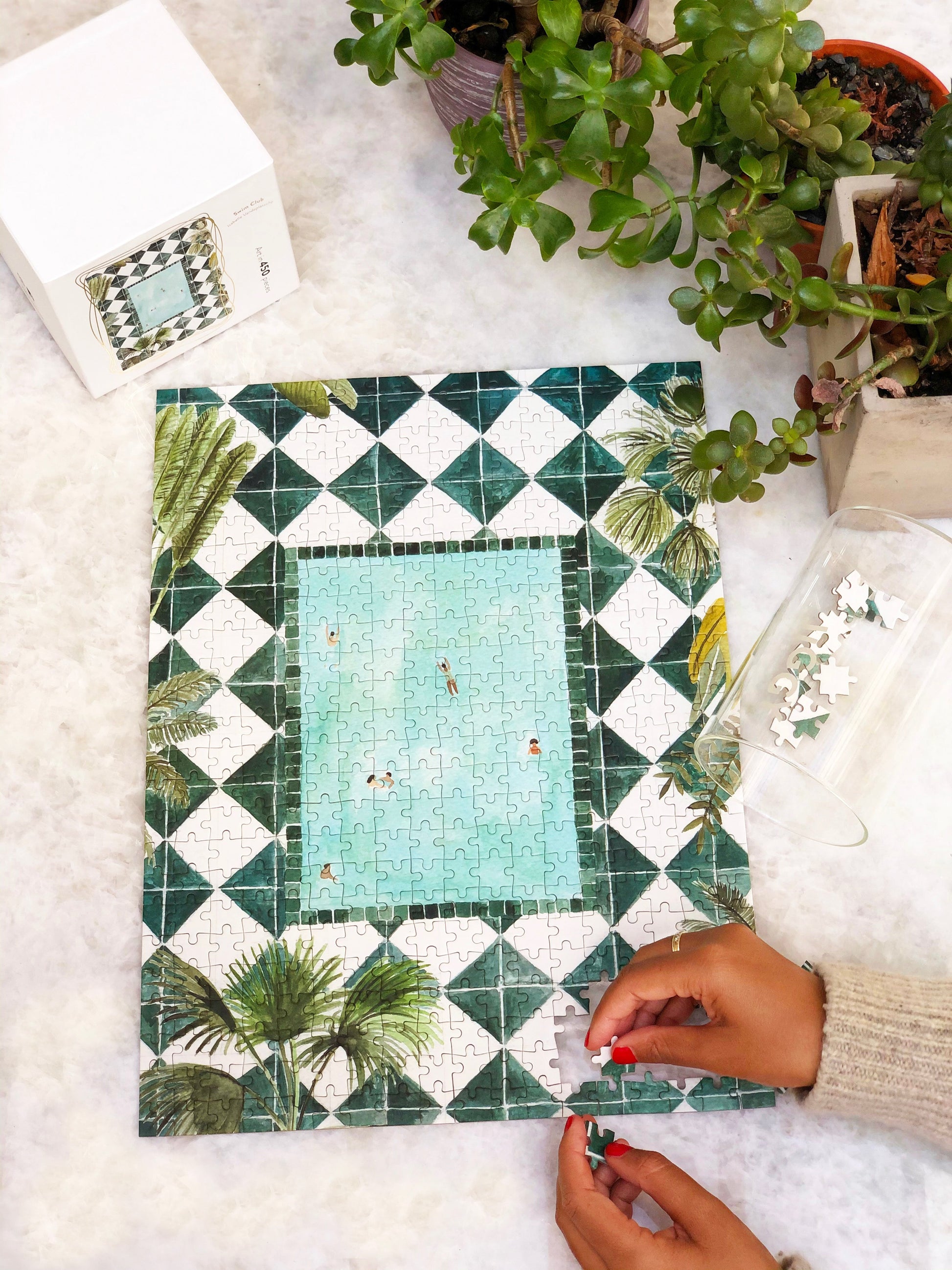 Each JIGGY puzzle comes in a reusable glass jar and includes a tube of puzzle glue, a straight-edge tool to spread the glue and a print of the art to follow.