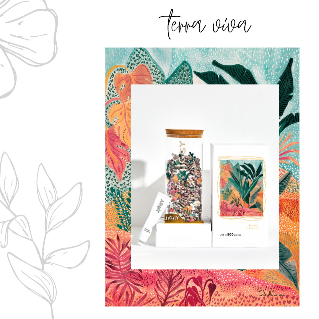 Each JIGGY puzzle comes in a reusable glass jar and includes a tube of puzzle glue, a straight-edge tool to spread the glue and a print of the art to follow.