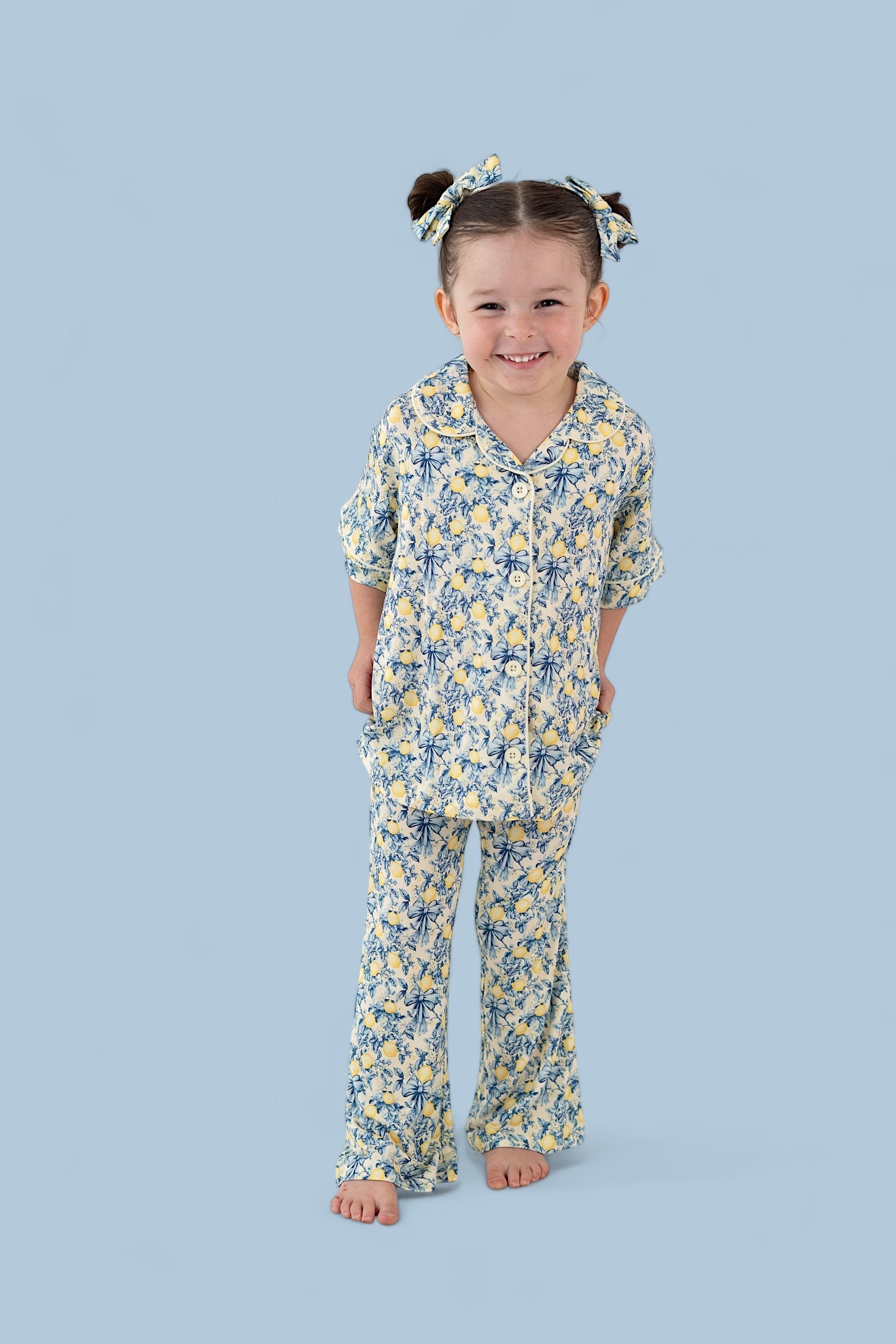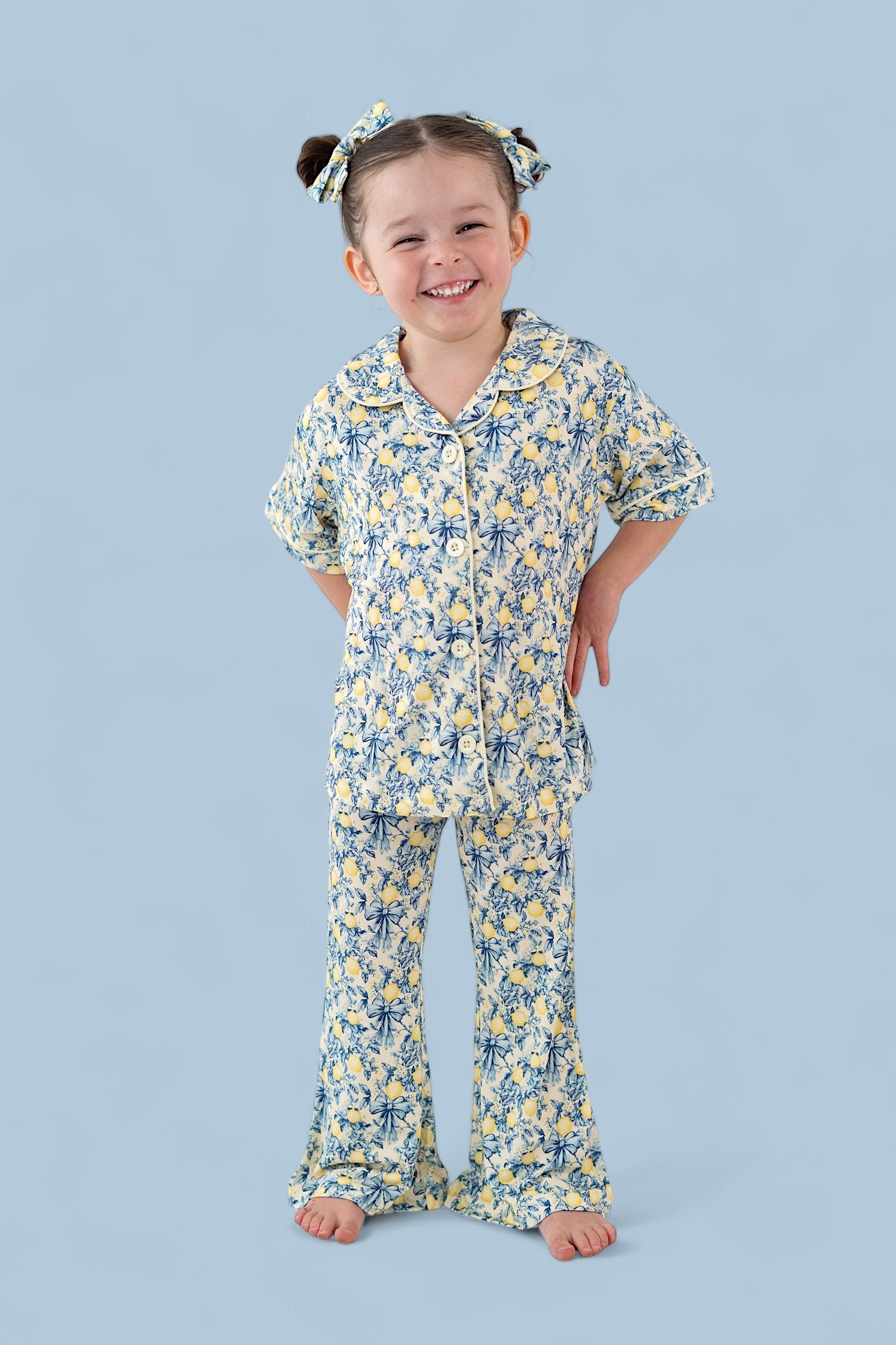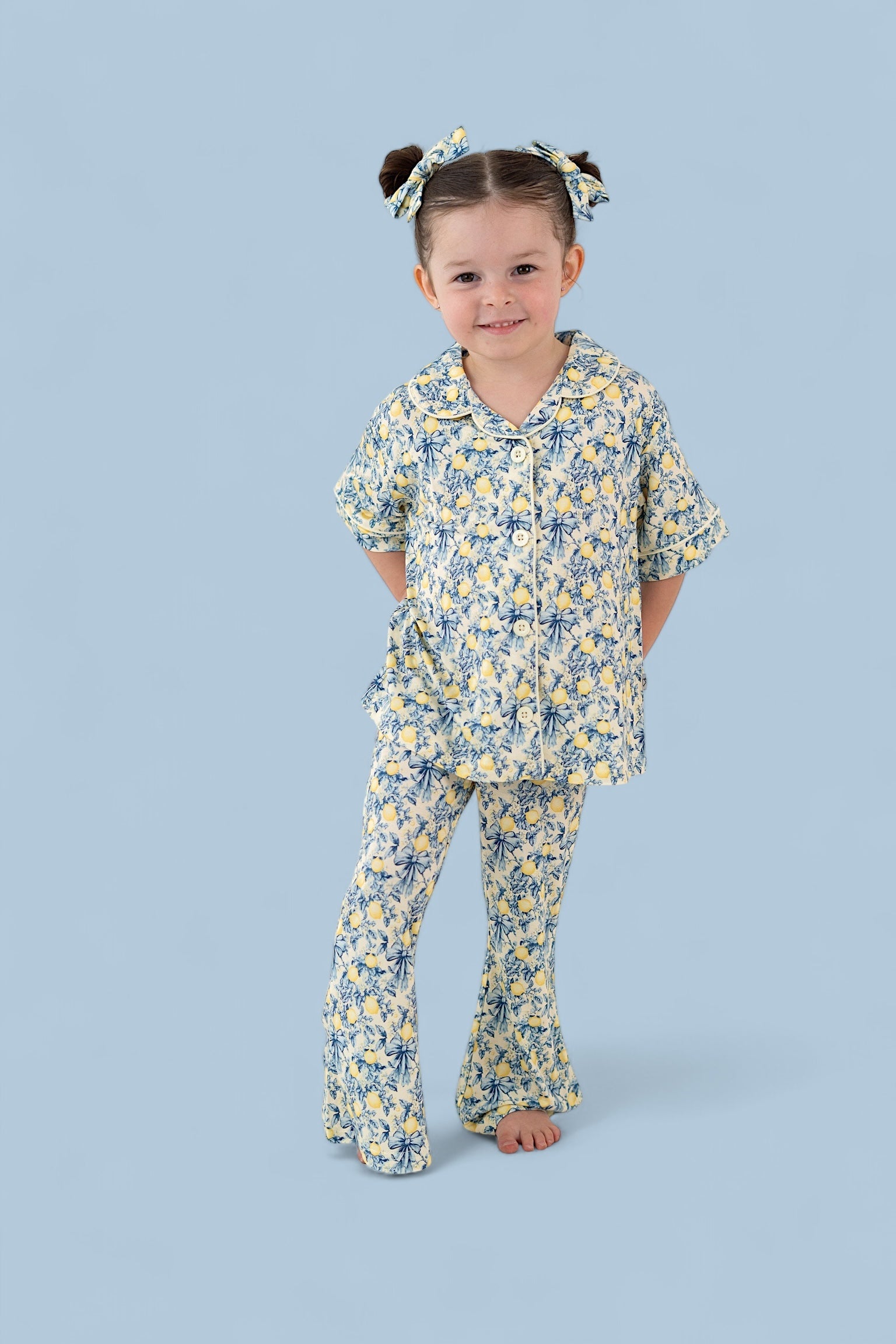 Step into a world of timeless elegance with our Vintage Citrus Toile Dream Girl’s Flare Set—a vision of charm and sophistication inspired by the delicate artistry of classic French toile. This enchanting set features a breathtaking blue botanical design, adorned with golden lemons and romantic bows, evoking the beauty of a sun-drenched orchard in the heart of Provence.