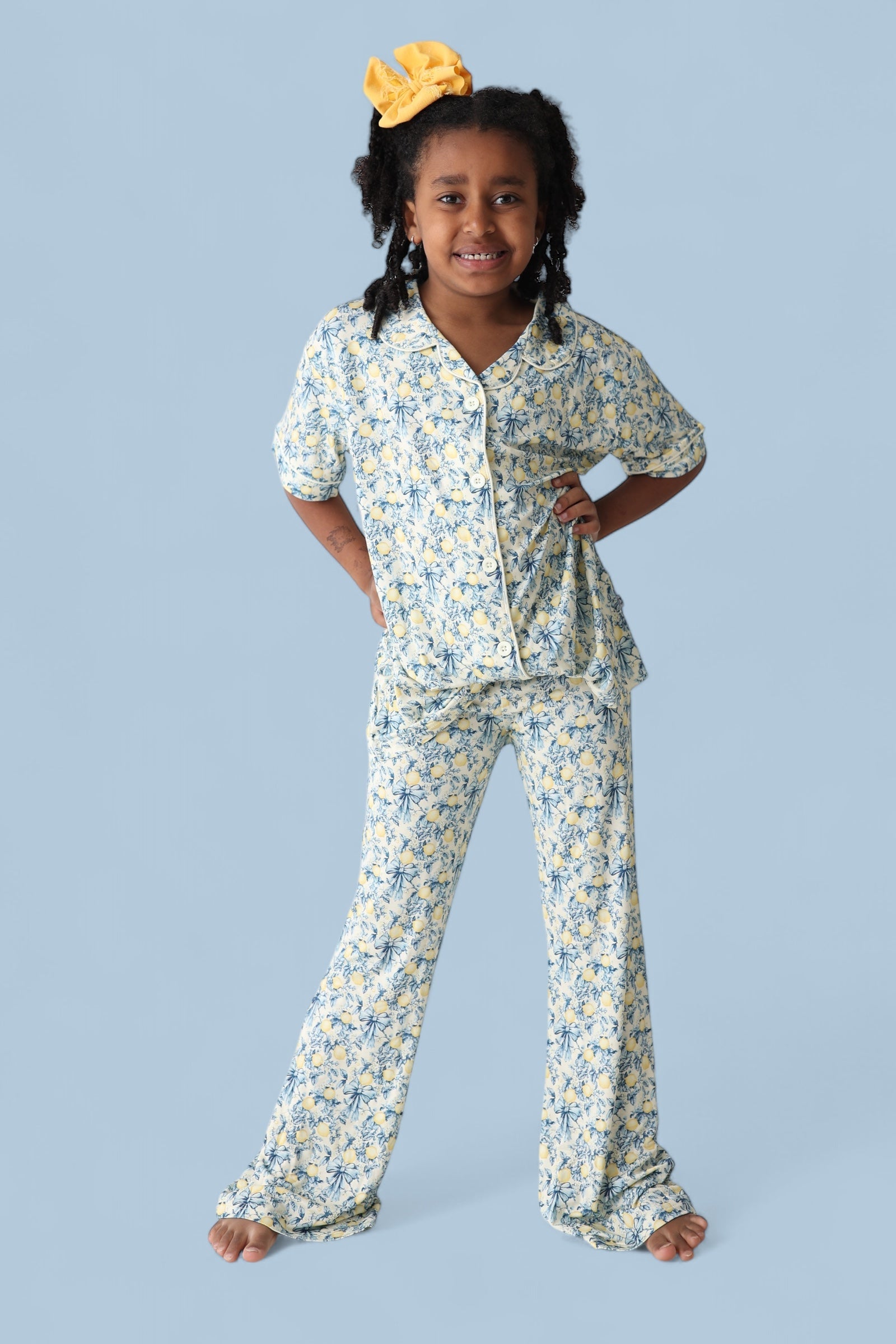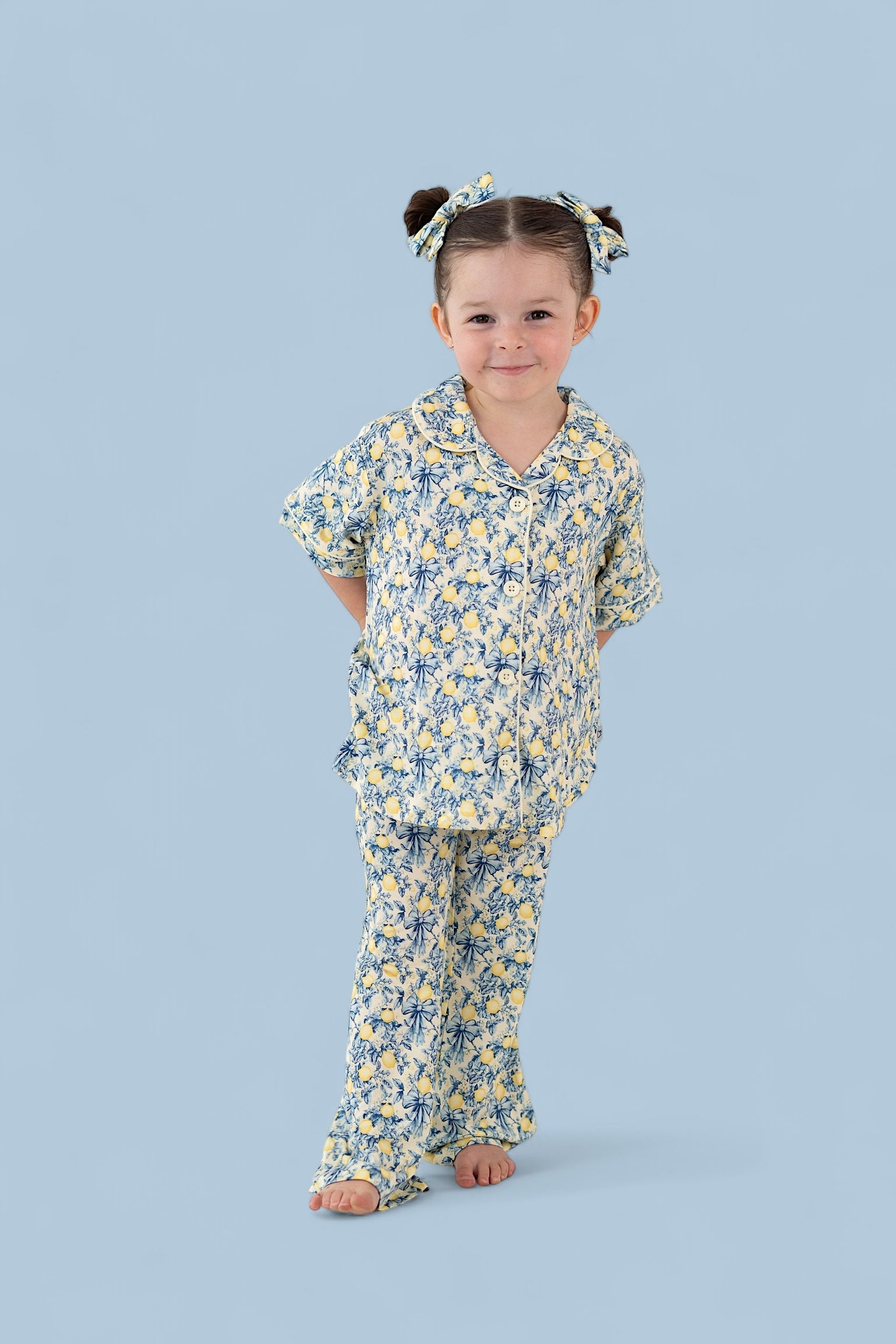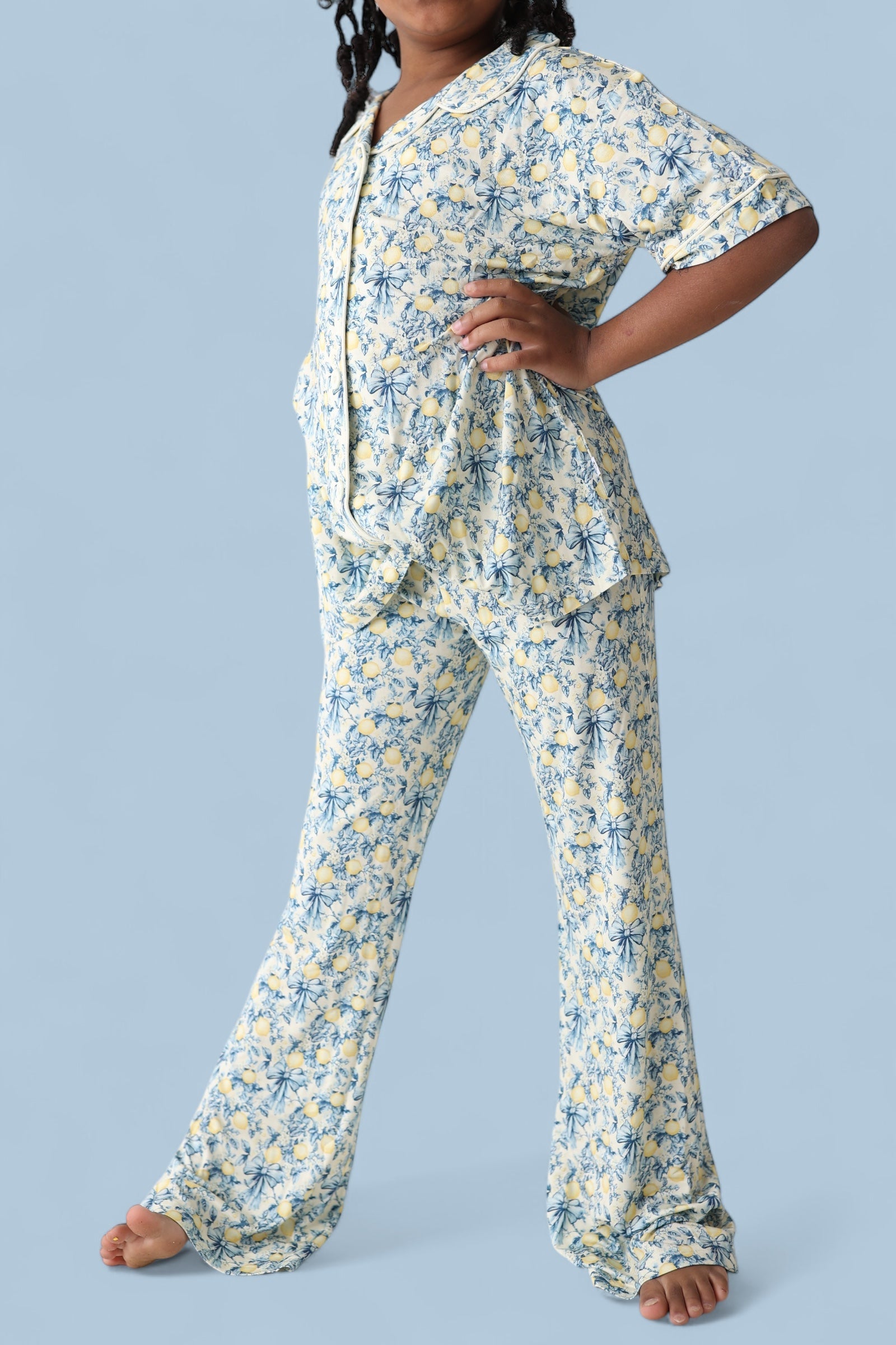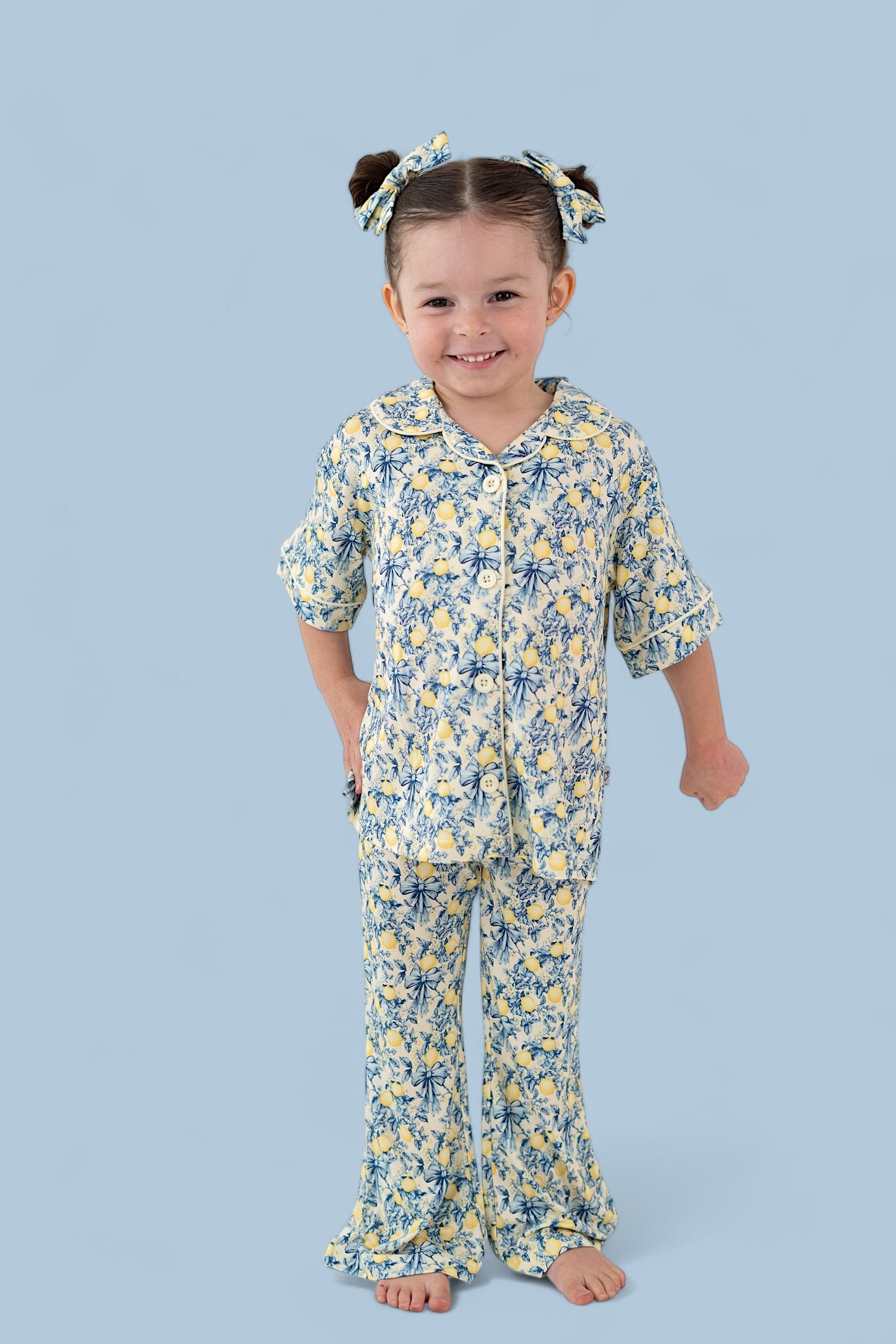 Step into a world of timeless elegance with our Vintage Citrus Toile Dream Girl’s Flare Set—a vision of charm and sophistication inspired by the delicate artistry of classic French toile. This enchanting set features a breathtaking blue botanical design, adorned with golden lemons and romantic bows, evoking the beauty of a sun-drenched orchard in the heart of Provence.