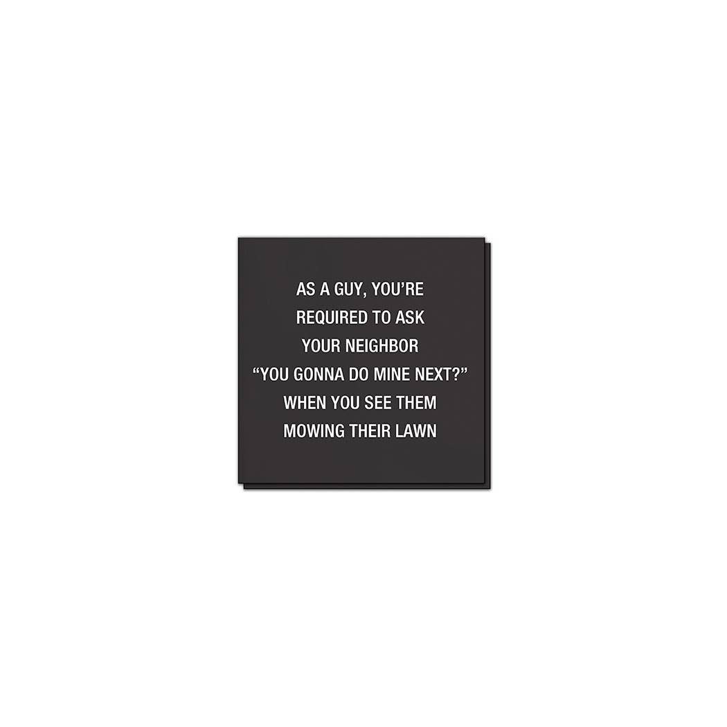 As a guy, you're required to ask "You gonna do mine next?" when you see them mowing their lawn.